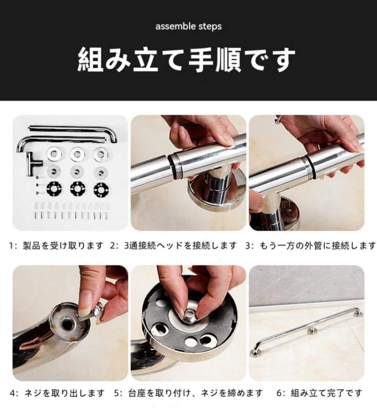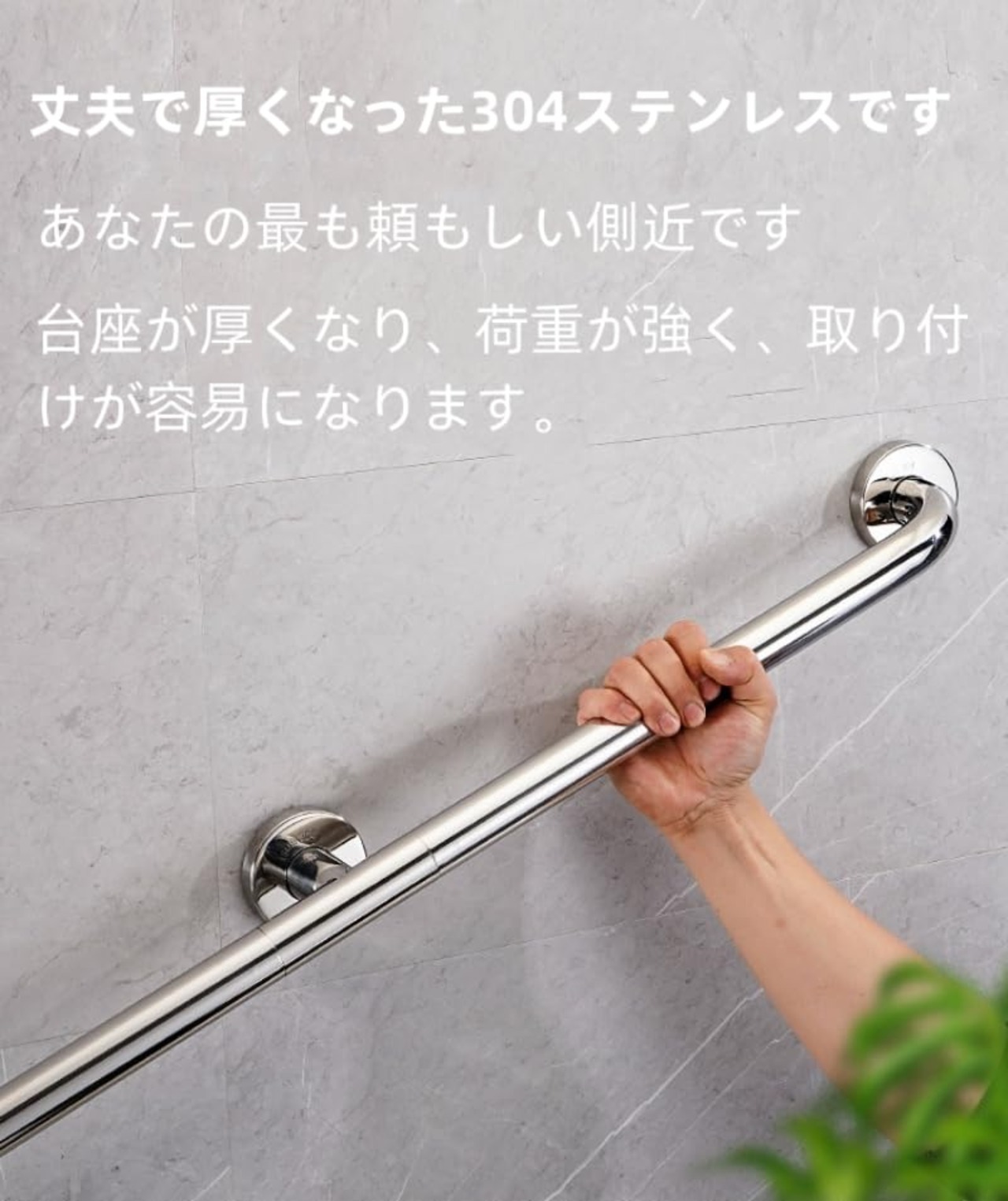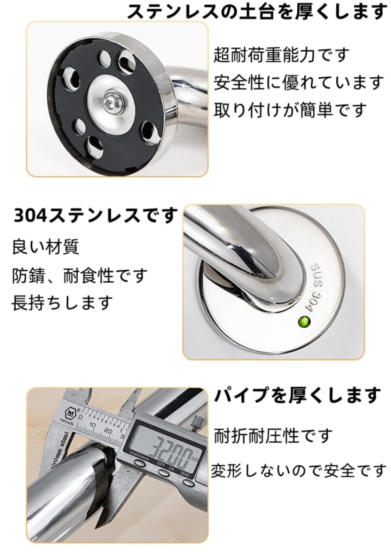荷重:壁肉厚めたステンレスパイプとネジ止めの仕様を採用し、通常のステンレス製品よりも荷重が60%も大きくなりました。玄関、トイレ、浴室、お風呂様々なところにご安心に使えます。