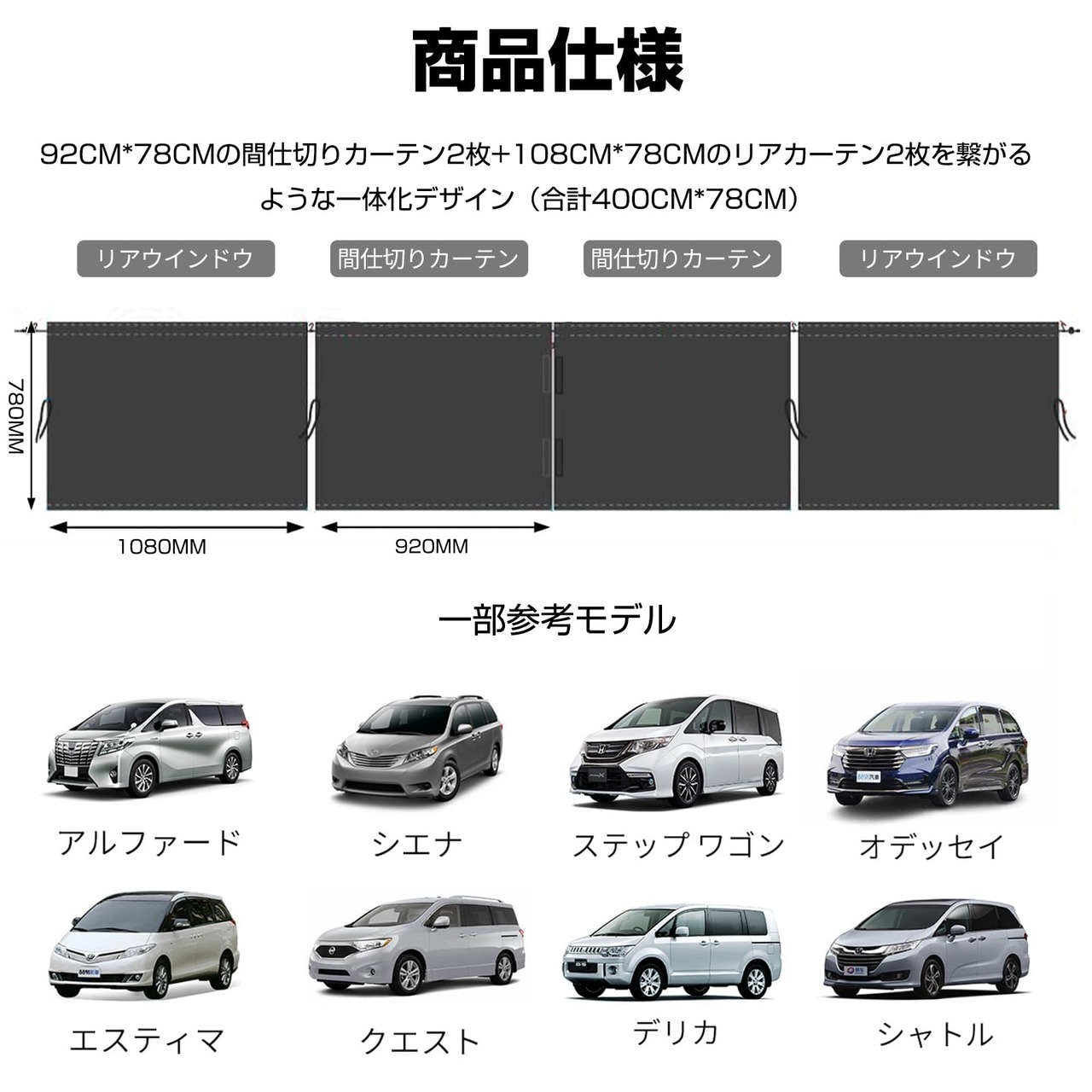 【MPV対応】92CM*78CMの間仕切りカーテン2枚+108CM*78CMのリアカーテン2枚を繋がるような一体化デザイン(合計400CM*78CM)、ほとんどのMPVに対応可能です。ご注文の前に、ご愛車のサイズに合わせるかどうかをご確認いただけますようにください。