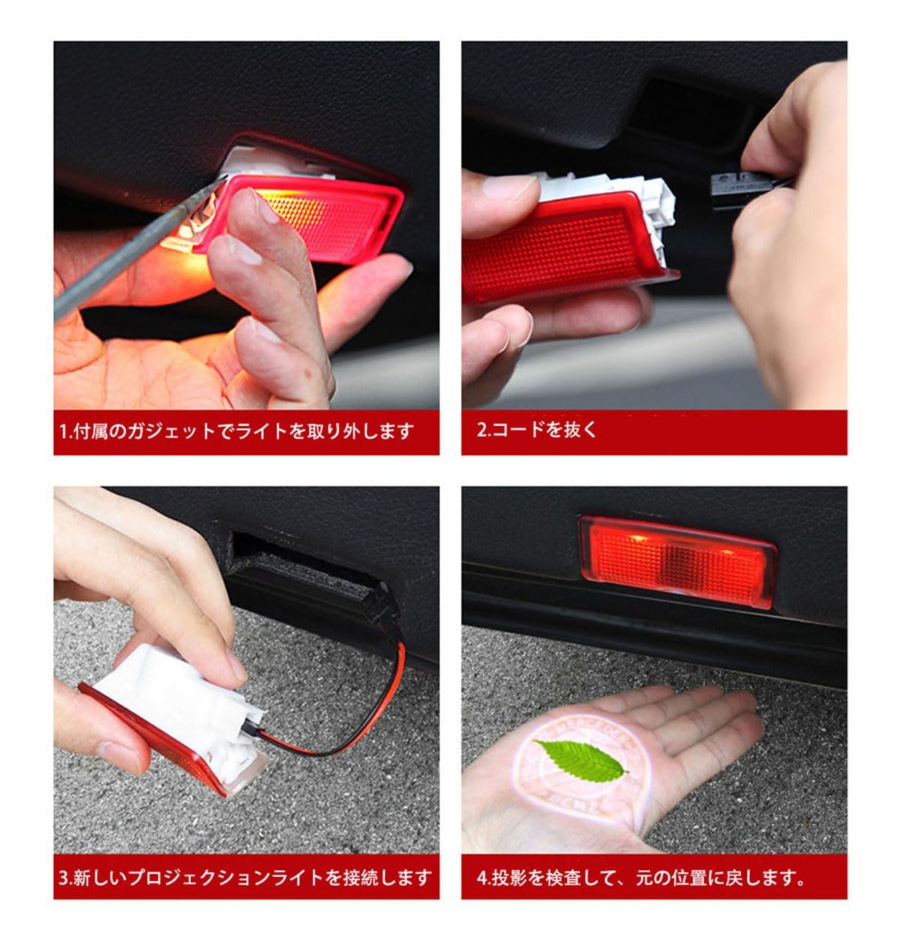 『取り付け簡単』:交換は簡単で、ケーブルがなく、古いドアのランプだけを交換します。ドアを開けると、マークは地上に投影される。注:車両にドア照明がない場合は、ウェルカム ランプを設置することは推奨されません。ご注意ください!