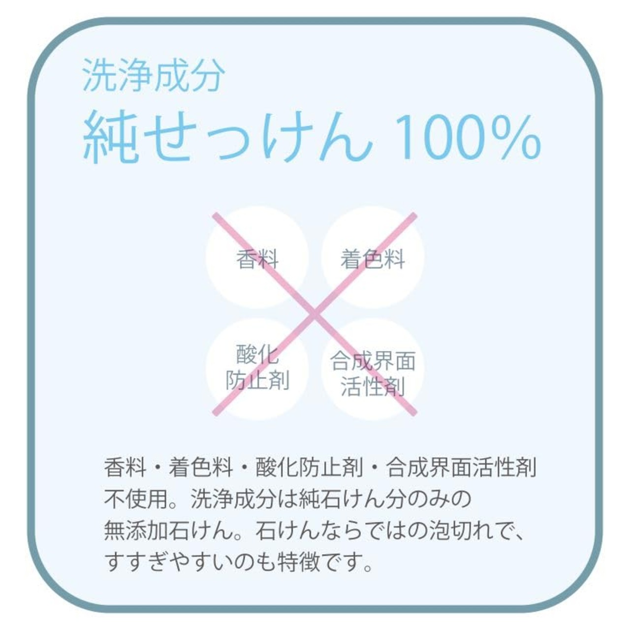 香料・着色料・酸化防止剤・合成界面活性剤 不使用。洗浄成分は純石けん分のみの 無添加石けん。石けんならではの泡切れで、 すすぎやすいのも特徴です。