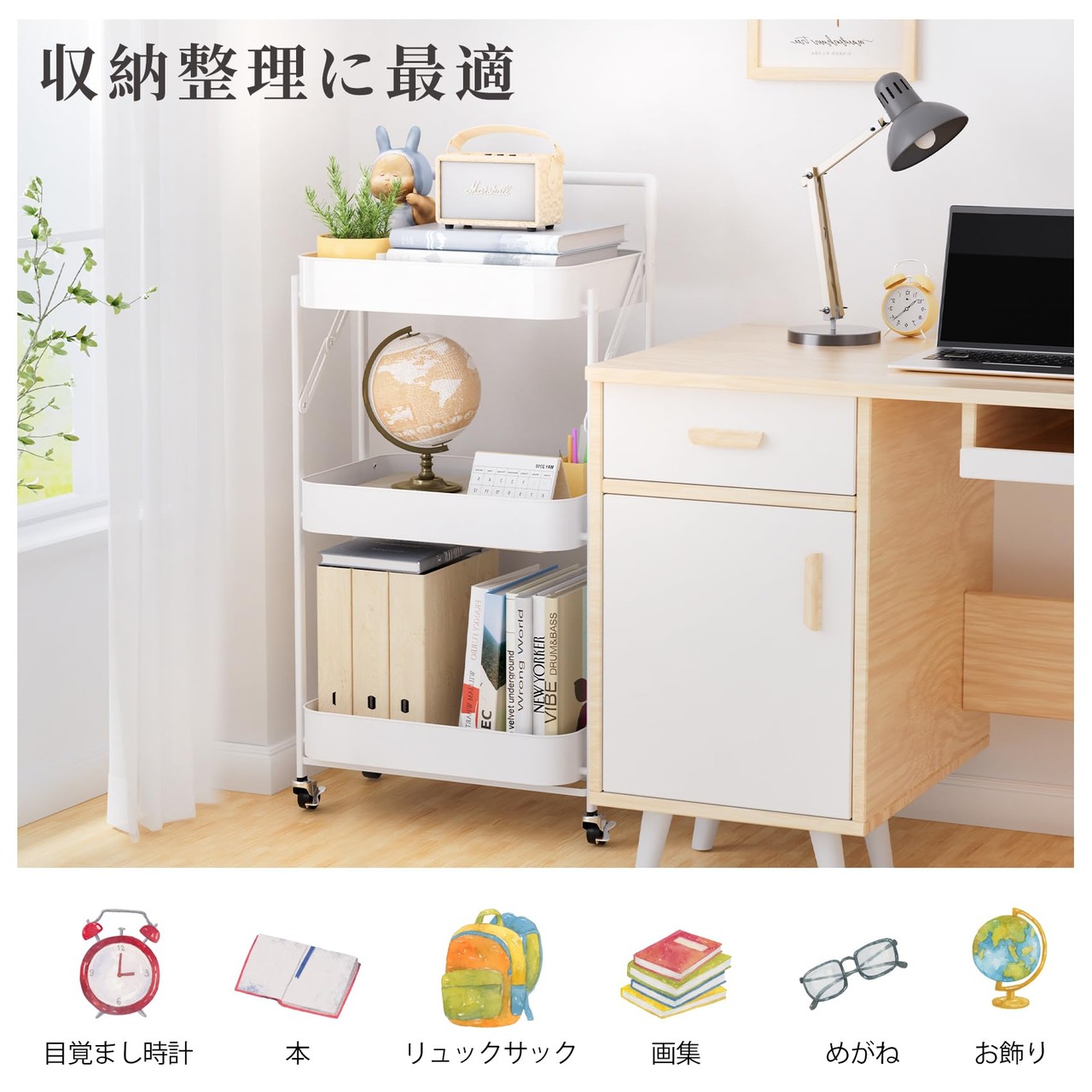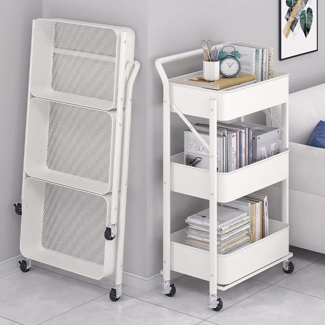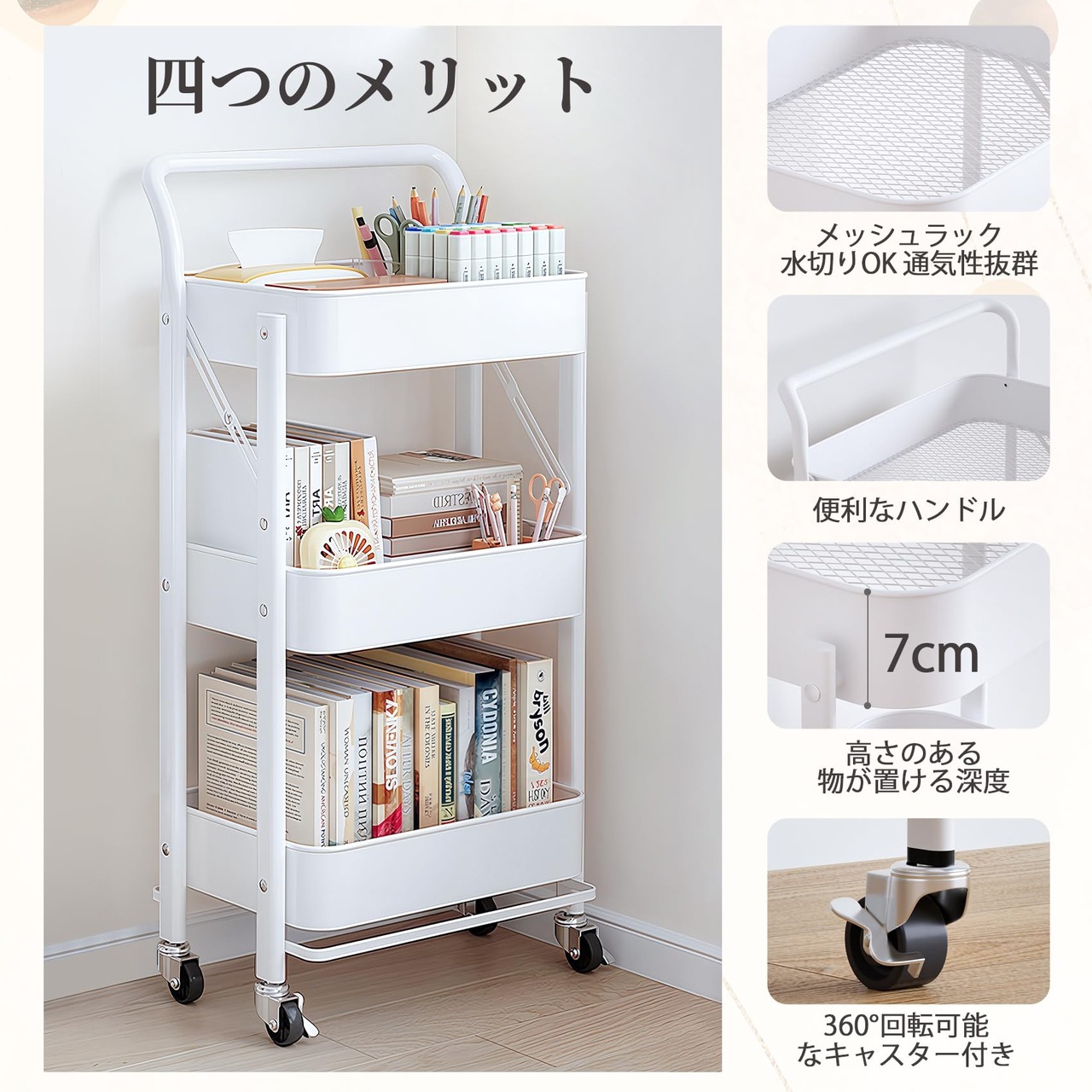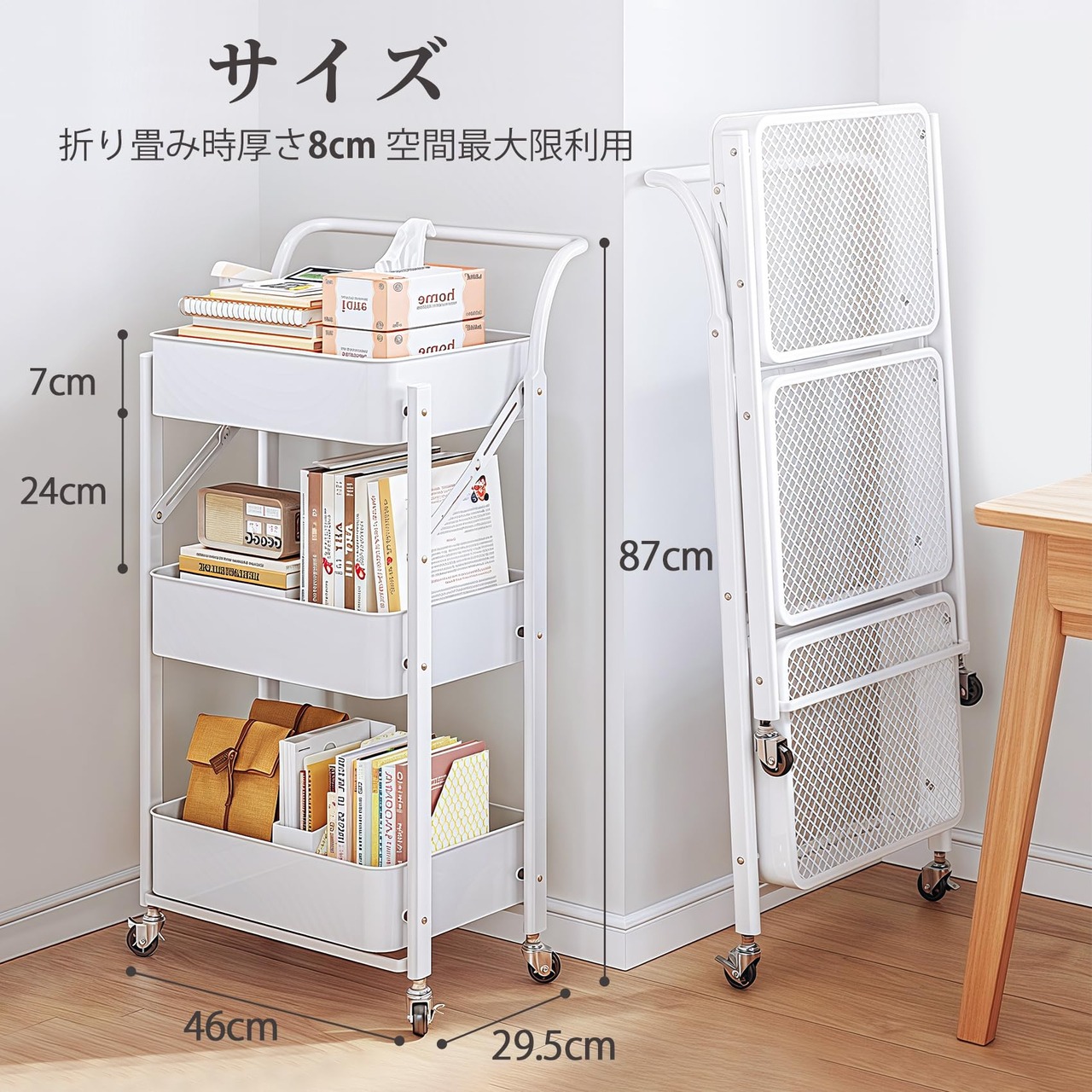 キッチンワゴン 組立不要 3段 折り畳み式 スチールラック 幅46×奥行29.5×高さ87cm バスケットトローリー バスケットラック ハンドル キッチンラック キャスター付き 3段 棚 隙間収納 収納ワゴン 収納カート 収納ラック 移動式