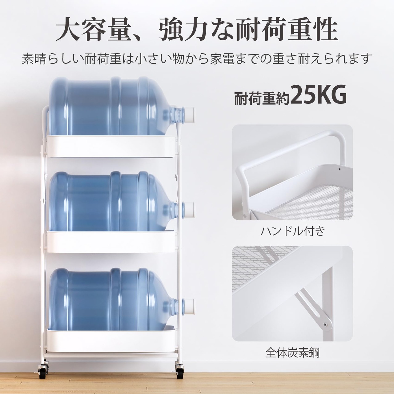 【使用便利】ハンドルとスチールキャスターで移動は非常に便利です。360°自由回転キャスターは4脚中2脚はストッパーが付いているので、使用中に不意の動きを抑制します。 お手入れも簡単です。普通の容器に溜まりやすいホコリは長時間が経てば清潔を保つことは非常に難しいです。下側には小さな穴が開いているメッシュラックが設計しました、通気性抜群で、ホコリも溜まりにくいです。湿気が多い場所・季節にも適しており、お手入れも簡単です。