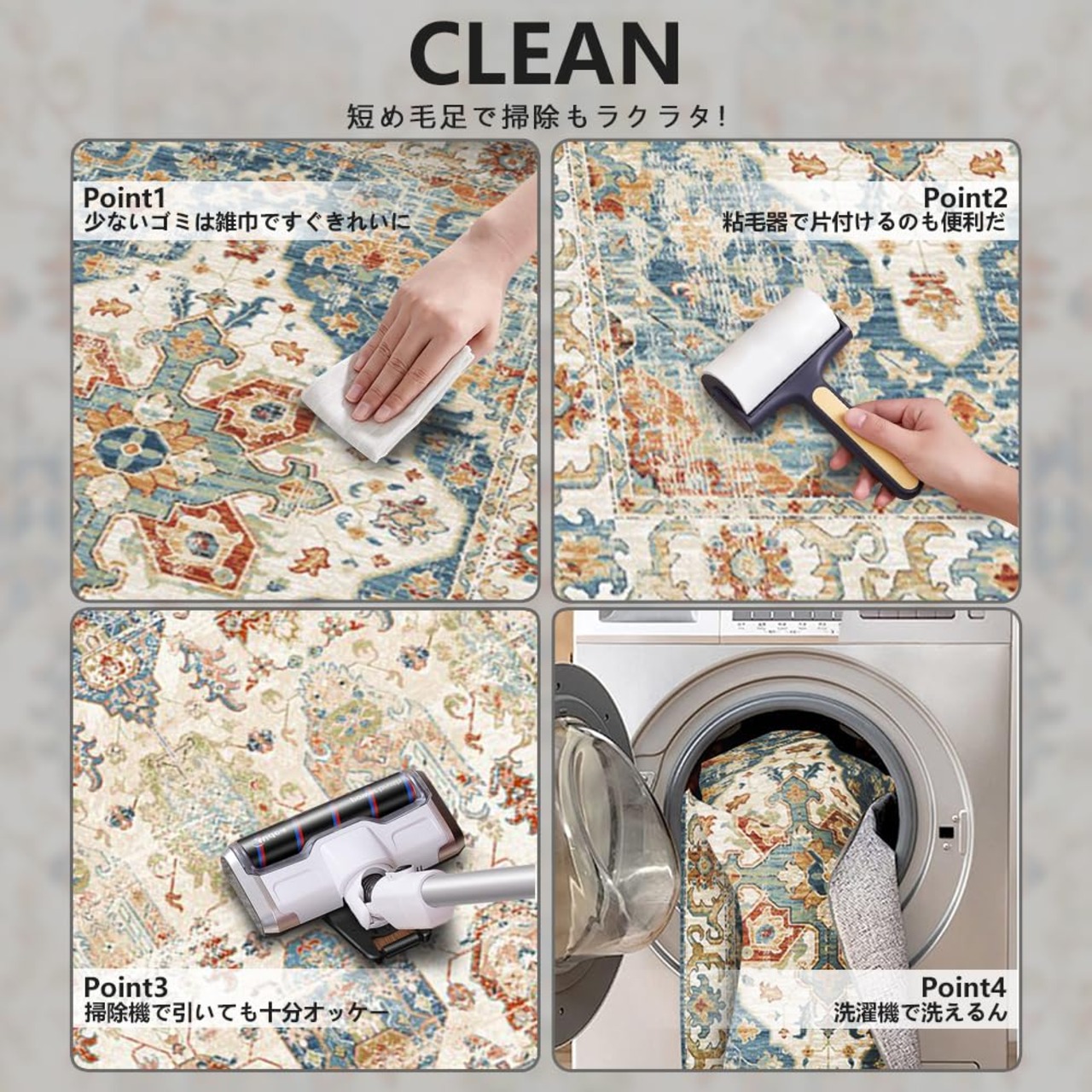 洗えるマット:水洗いや洗濯機もサポートします。洗濯機を使用するときに、お洗濯用ネットの使用をおすすめします。毎日のお掃除もらくらく。密度が高くて短めの毛足はゴミが絡みにくく掃除機もかけやすいから毎日のお掃除やお手入れが簡単で、清潔にお使いいただけます。