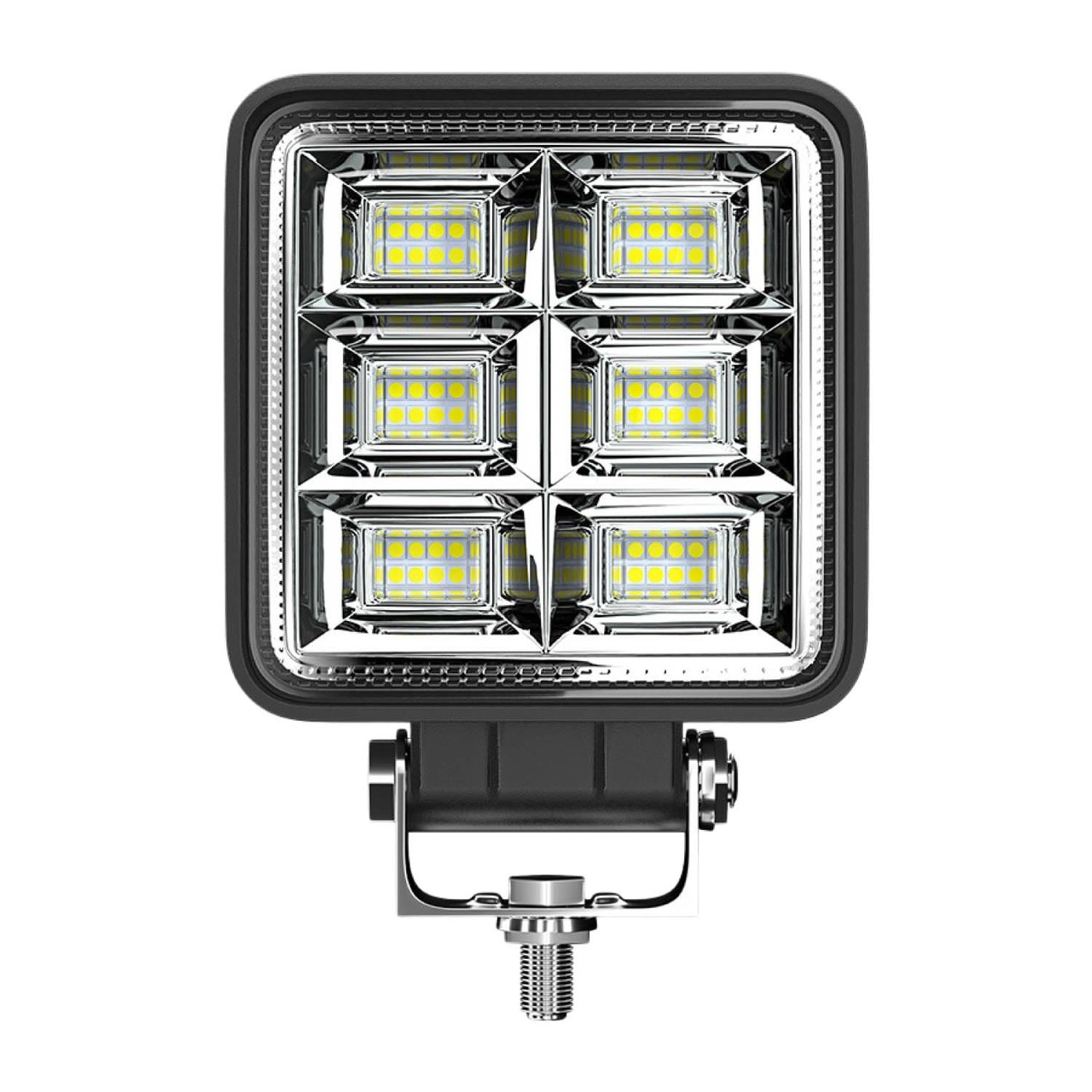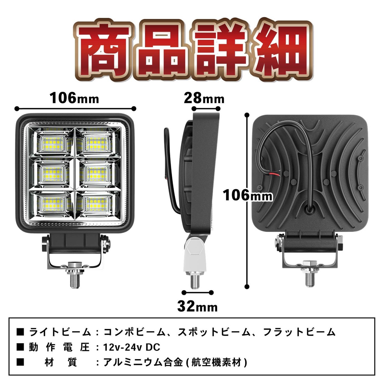サイズ(約):10.8×10.8×2.8 cm / 発光色:ホワイト(白) / 動作電圧: 12v-24v DC / 消費電力: 144W / 防水性能:IP 67 / 色温度: 6500K / ルーメン:8000lm / 使用可能温度:-40~80℃ / LEDバルブ寿命:50000時間以上 / セット内容:ワークライト本体、ステー&ネジ×2式