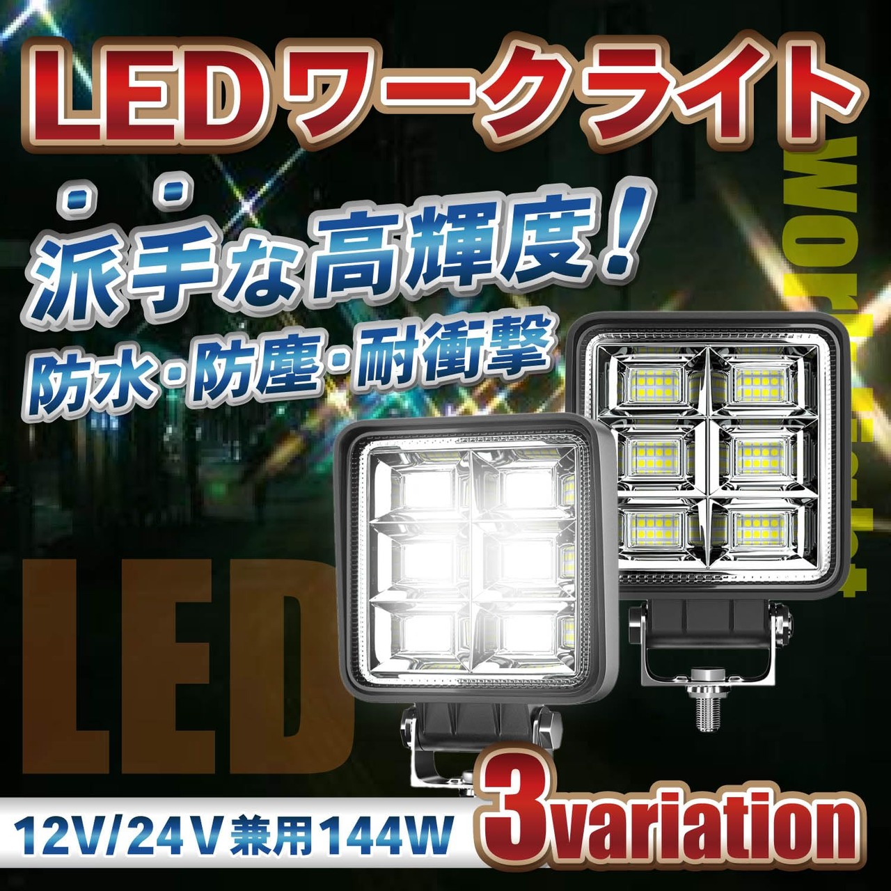 爆光タイプ(144w)の44連LEDワークライトです。12Vと24V兼用なので普通車はもちろん、トラック、ダンプ、船舶、重機、農作業、トラクター、コンバイン、フォークリフトなどにもお使いいただけます。
