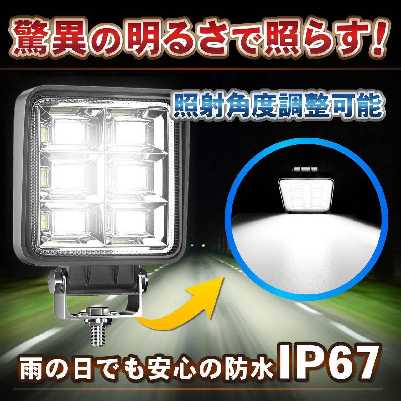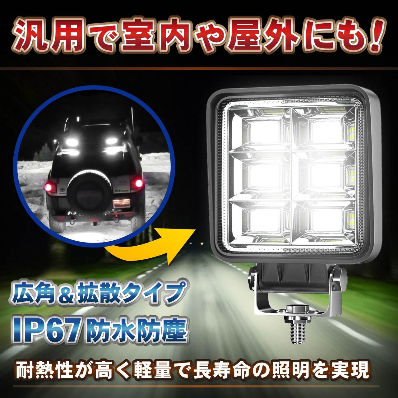 広角&拡散タイプの構造で広い範囲を照らすことができます。また、IP67レベルの防水防塵性能なので、雨天時、洗車時、砂埃が舞う環境でもタフに使うことができます。