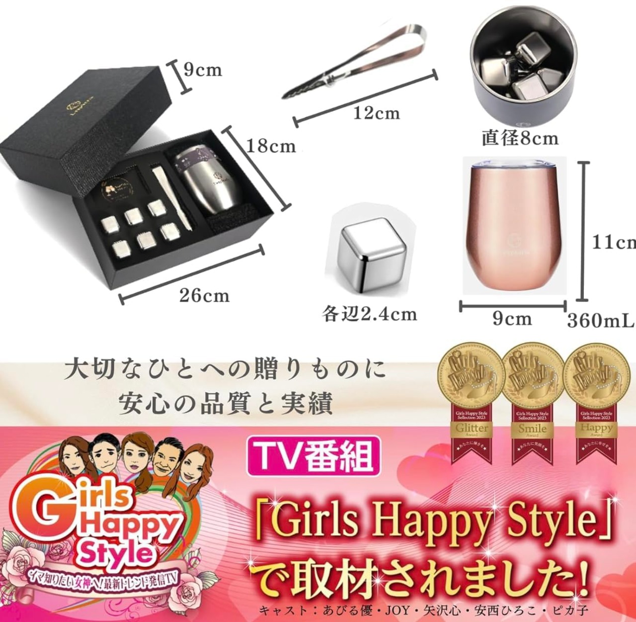 永久に溶けない氷「ビアキューブ」と真空二重構造で冷たい飲み物から温かい飲み物まで幅広く使えるタンブラーがセットになったギフトです