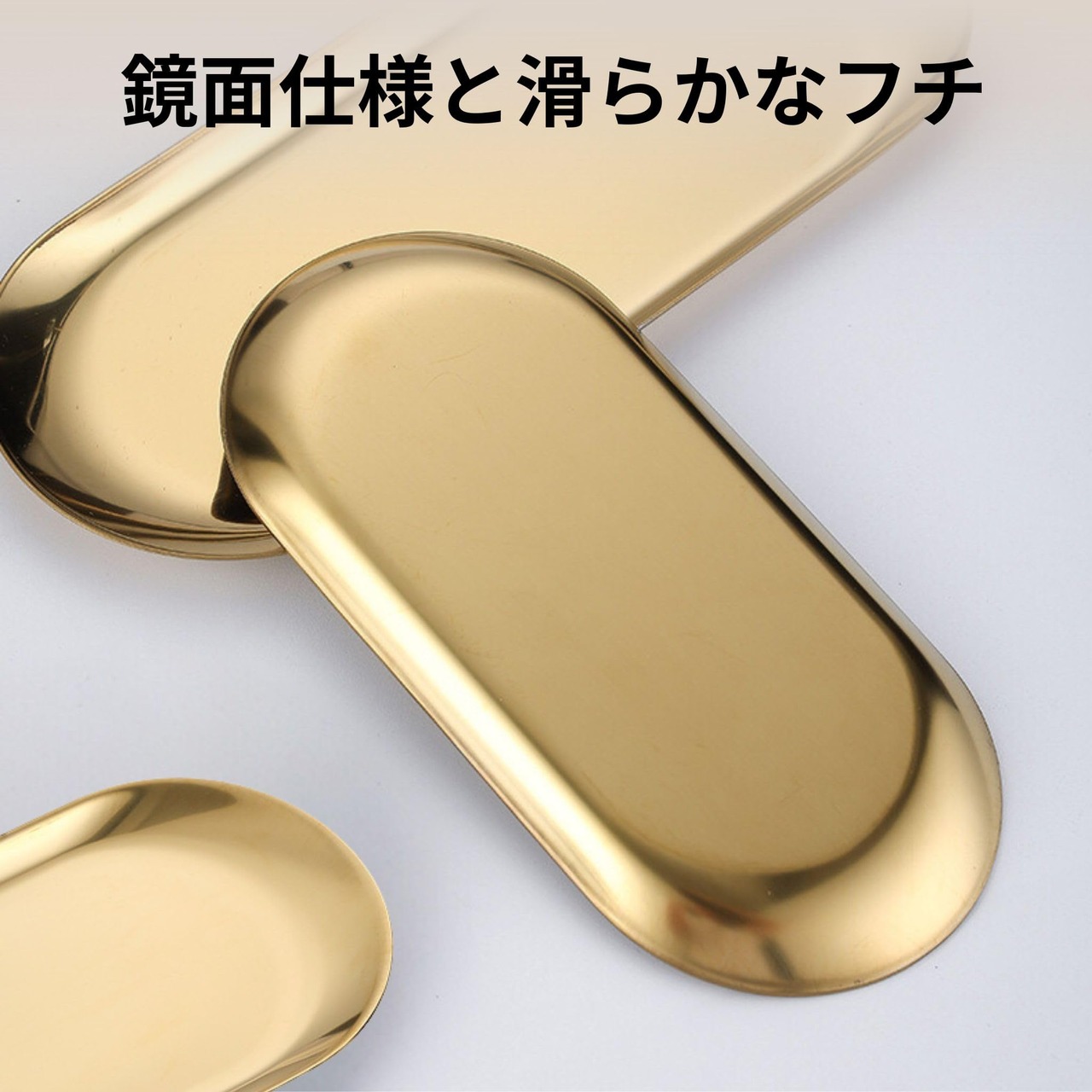 bath&bath おしぼり置き おしぼりトレー 金属 ゴールド 高級 北欧 おしゃれ 5個 セット </br></br>(高級おしぼりトレイ 5個セット)シンプルでありながらも高級感が漂う金属製のおしぼりトレイです。明るめのゴールドカラーと光沢のあるデザインは、飲食店やホテルの業務用として最適です。ステンレス製なので、長期間にわたってご使用いただけ、サビる心配がありません。</br>(小物置きトレーとしても活躍)このおしぼりトレイは、単なるおしぼり置きだけでなく、小物入れとしても優れています。鍵やアクセサリー、時計など、日常の小物を整理するのに最適です。表面は鏡のように綺麗に映り込む滑らかな鏡面加工が施されており、デザイン性も兼ね備えています。明るいゴールドカラーは、インテリアに華を添えます。</br>(多彩な用途に対応する汎用性)このおしぼりトレイは、業務用コイントレーとしてだけでなく、アクセサリートレイやキャッシュトレイとしても幅広く使用できます。</br>(高品質ステンレス製の信頼性)このおしぼりトレイは、高品質のステンレスを使用しており、錆びに強く耐久性に優れています。明るいゴールドカラーと光沢感が美しいスタイリッシュなデザインは、飲食店やホテルだけでなく、ご自宅でもおしゃれなインテリアアイテムとして活躍します。汚れた場合も簡単に清掃でき、常に美しい状態を保ちます。</br>(注意事項)本製品に説明書は付属しておりません。製品の使用に関連するいかなる損害や事故についても当社は一切の責任を負いません。製品のご使用にあたっては、ご自身での注意深い取り扱いをお願いいたします。</br></br>