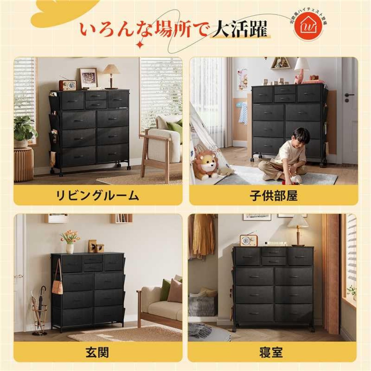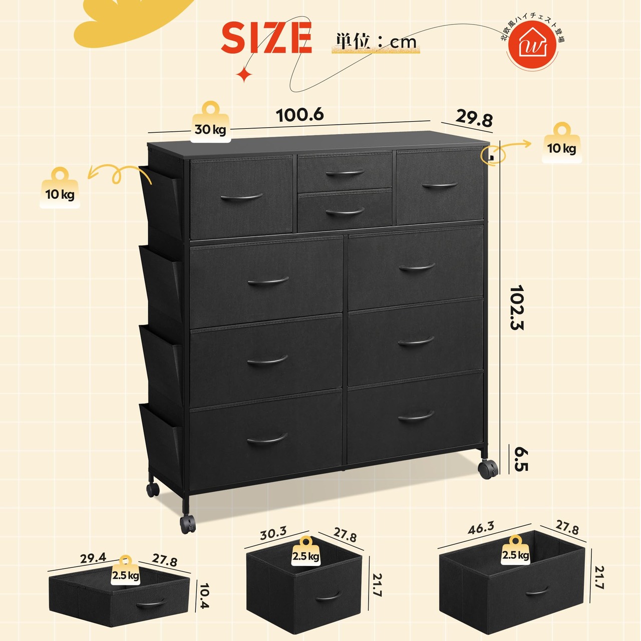 2.収納スペースたっぷり: 見た目はシンプルだけど、10つの引き出しもあり、収納力抜群です。下部の4つの大きな引き出しは、毛布、スカーフ、靴下、子供のおもちゃや衣類などをたっぷり収納できます。上部の小さい引き出しは、身に着ける衣類や靴下などを収納できます。サイドポケットは左右どちらにでも交換可能で、さらに4つの空間があり、靴下や鍵などの小物を収納できます。