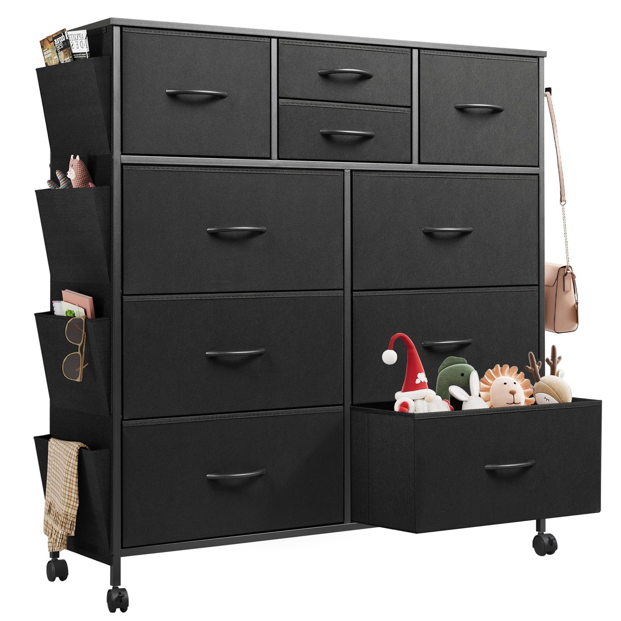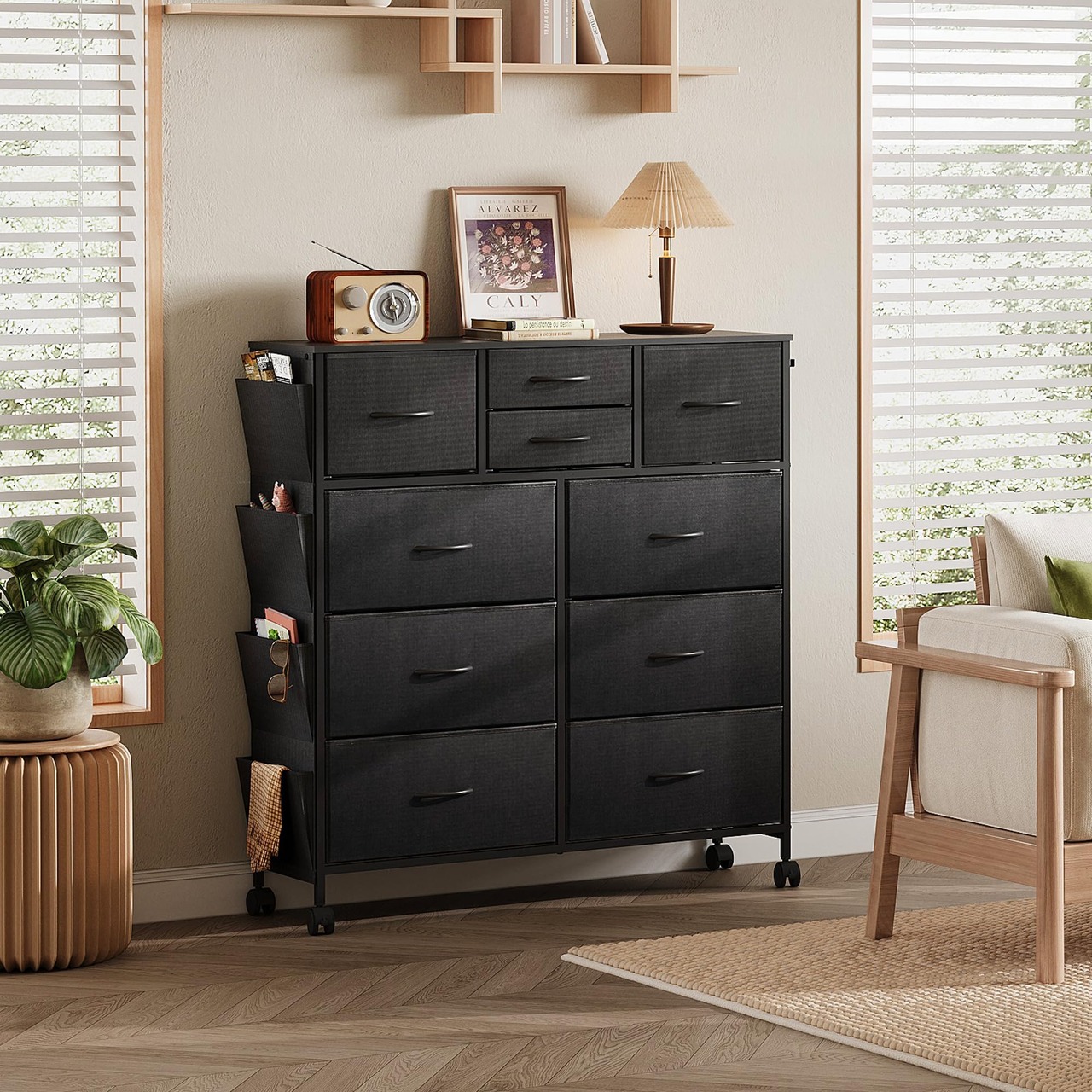 WLIVE チェスト タンス キャスター付き サイドポケット付き 4段10杯 箪笥 ハイチェストチェスト4段 リビング収納 おしゃれ 収納チェスト 引き出し 大容量 洋服タンス 布製 衣類収納 北欧 シンプル ブラック