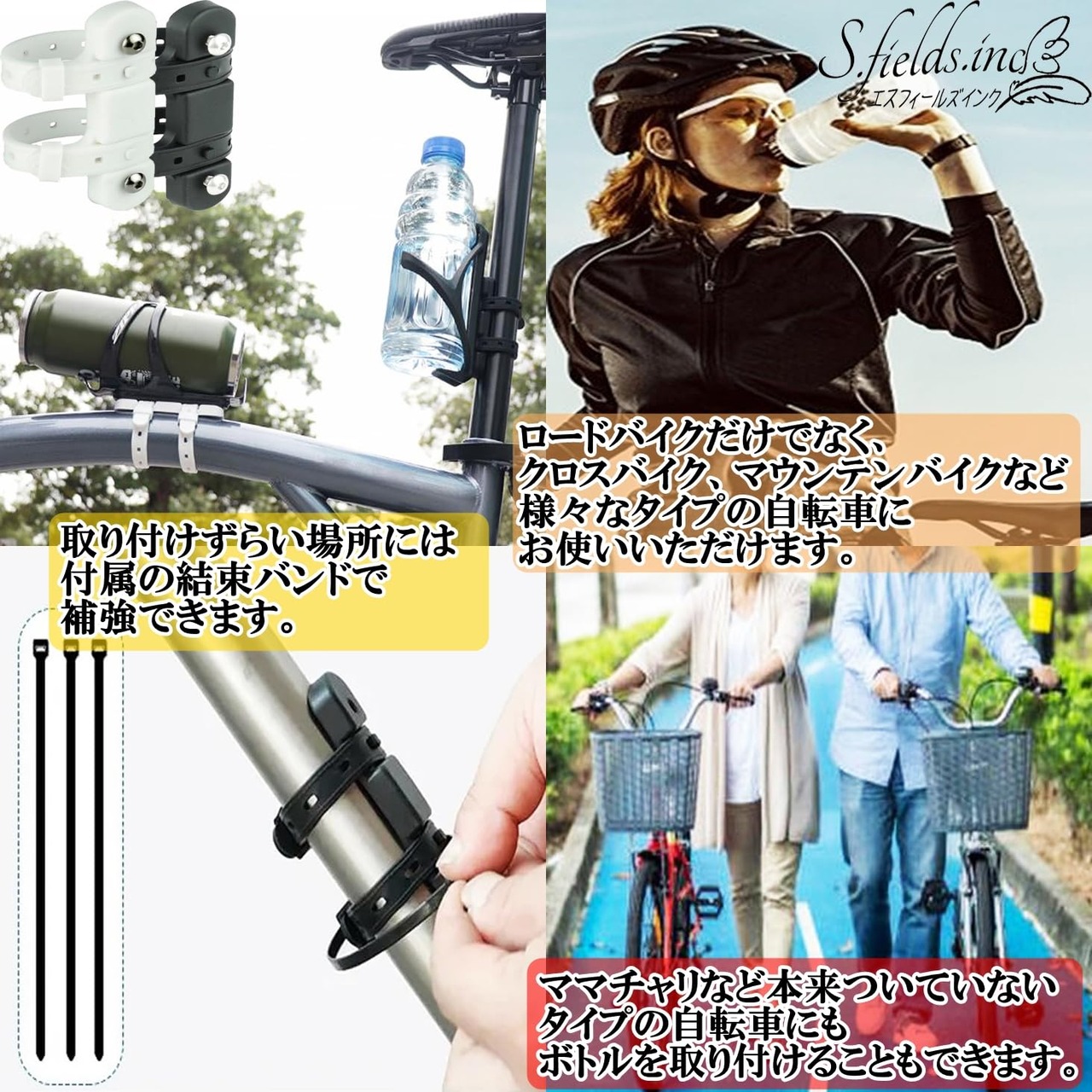 ロードバイクだけでなく、クロスバイク、マウンテンバイクなど様々なタイプの自転車にお使いいただけます。ママチャリなど本来ついていないようなタイプの自転車にもボトルを取り付けることもできます。取り付けずらい場所には付属の結束バンドで補助してください。