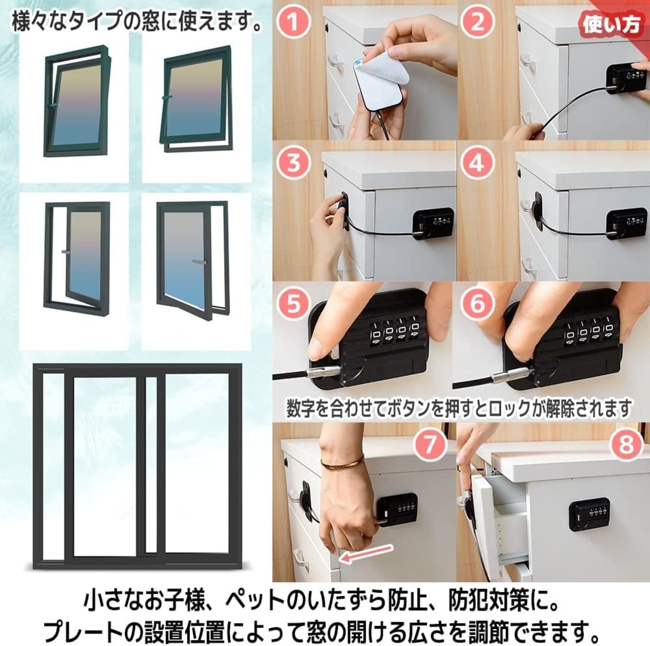 ペット、赤ちゃん対策、セキュリティー対策に。開閉窓、スライド窓、冷蔵庫や家具などに取り付ける開閉窓ロックです。両面テープで簡単取り付け。4桁のダイヤル式ワイヤーロックです。