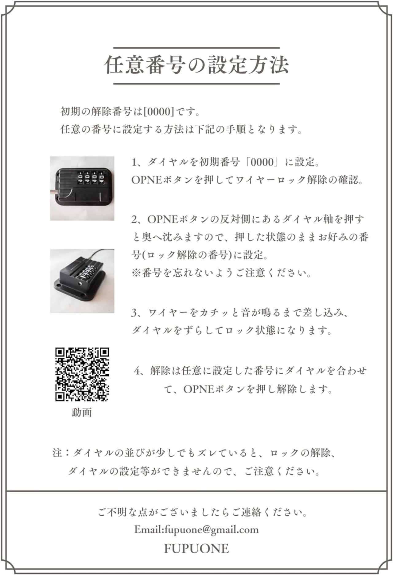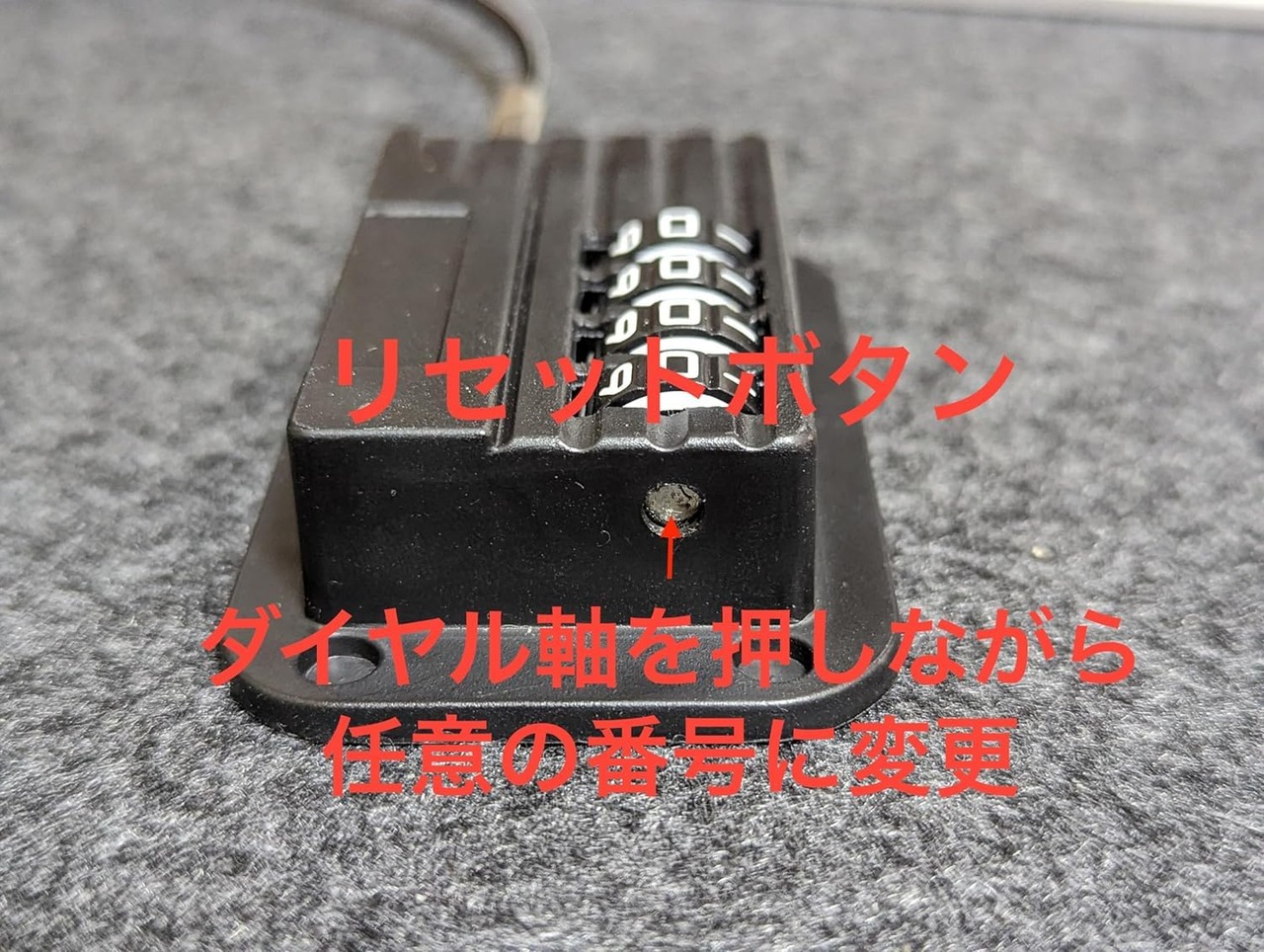【解錠及び番号の設定方法】 1、ダイヤルを初期番号「0000」に設定。 OPNEボタンを押してロック解除の確認。 2、[ダイヤル設定] OPNEボタンの反対側にあるダイヤル軸を押すと奥へ沈みますので、押した状態のままお好みの番号(ロック解除の番号)に設定。 ※番号を忘れないようご注意ください。 3、[ワイヤーを繋ぐ] OPNEボタンを押した状態でワイヤーがカチッと音が鳴るまで奥まで差し込み、ダイヤルをずらしてロック状態になります。注:ダイヤルの並びが少しでもズレていますとロックの解除、ダイヤルの設定等ができませんのでご注意ください。