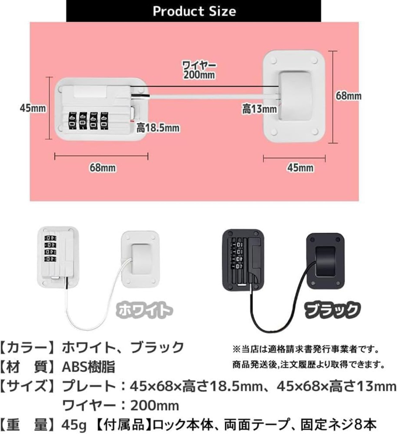 【カラー】ホワイト、ブラック【材質】ABS樹脂【サイズ】プレート:45×68×高さ18.5mm、45×68×高さ13mm、ワイヤー200mm【重量】45g