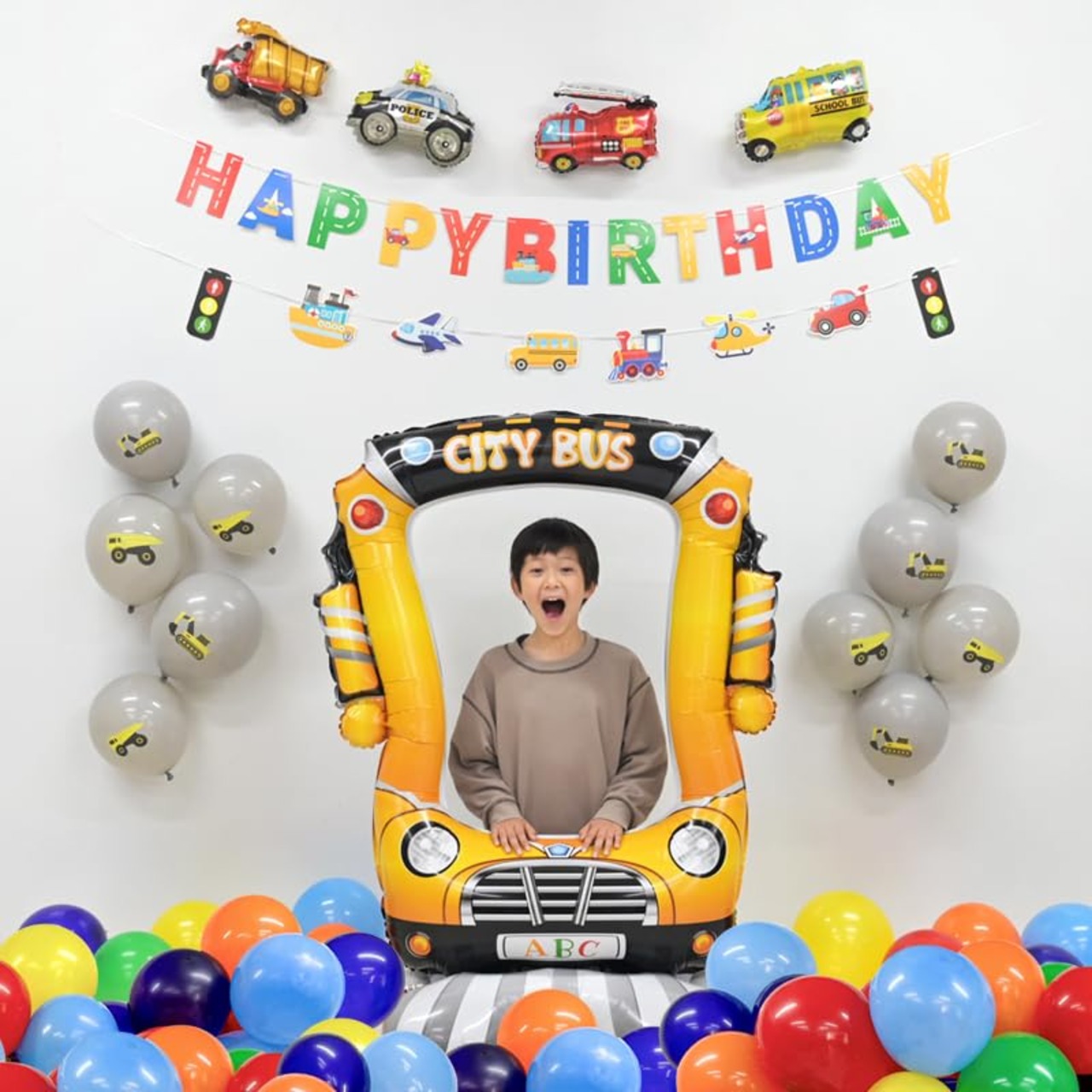 【セット内容】カラフルゴム風船 ×60個、乗り物バルーン 約 35cm × 各1個、大きなバスバルーン 約 90cm×130cm × 1個、プリントゴム風船 2種類 12inch × 各5個、バースデーガーランド × 1個、乗り物ガーランド × 1個