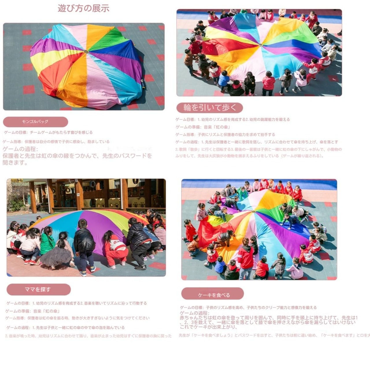 商品の説明耐久性のあるオックスフォード布。 遊びのパラシュートは、オックスフォードの生地、良い頑強さと使用する耐久性で作られています、引き裂くのは簡単ではない子供たちの屋外ゲームを一緒に。 託児所や小学校の先生方に、子どもと一緒に活動をするのに適しています。<br> 仕様<br> 色:8色<br> 素材:生地<br> サイズ:2-8M<br> ご注意: 1.お品物の色合いは、写真撮影、パソコン画面表示等の環境の違いにより、若干異なる場合がございますので予めご了承下さい。届いた実物が基準となります。 2.手動による測定のため、サイズの差が1-5mmあるようにしてください。<br> 防水素材でできているので、服を濡らす心配はありません。協力とグループプレーを促進し、筋肉を築き、健康を維持するための素晴らしい製品です。<br> 幅広い用途に適しており、野外遊びだけでなく、室内遊びでも誕生日パーティーやピクニックなどにも使えます。<br> 虹色、明るくカラフル、人目を引く、子供たちの興味をそそることができます。大きな遊びが楽しめま音楽に合わせながら集団で活動することでリズム感や協調性、表現力など様々なことが学べます。