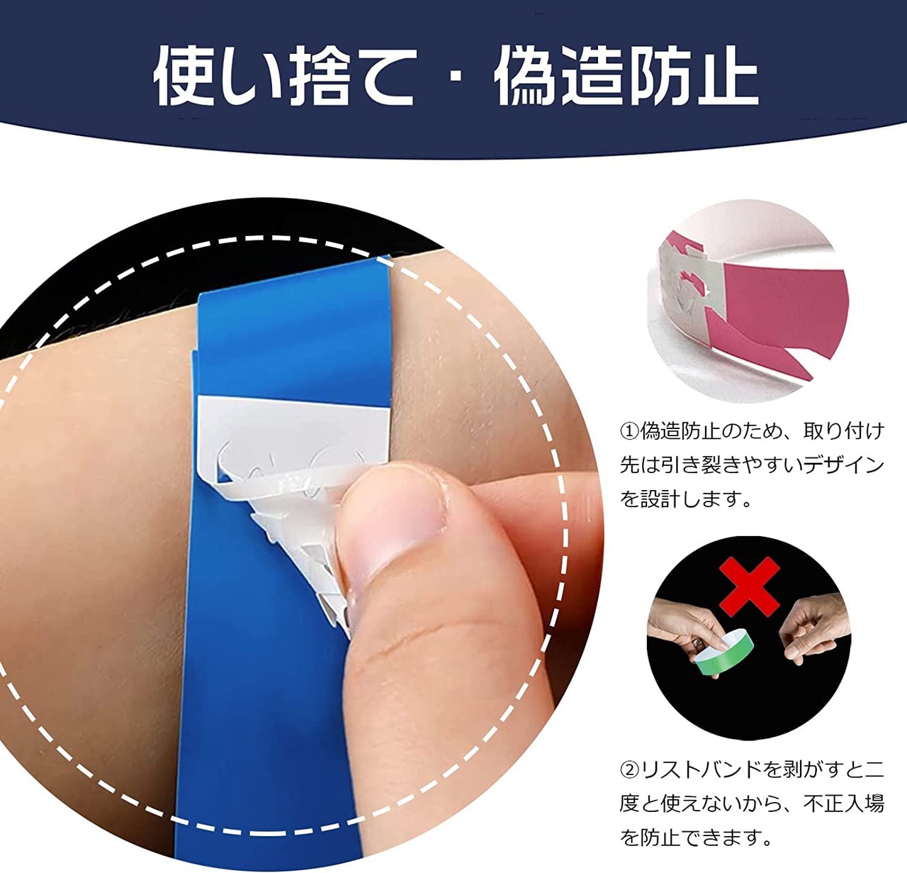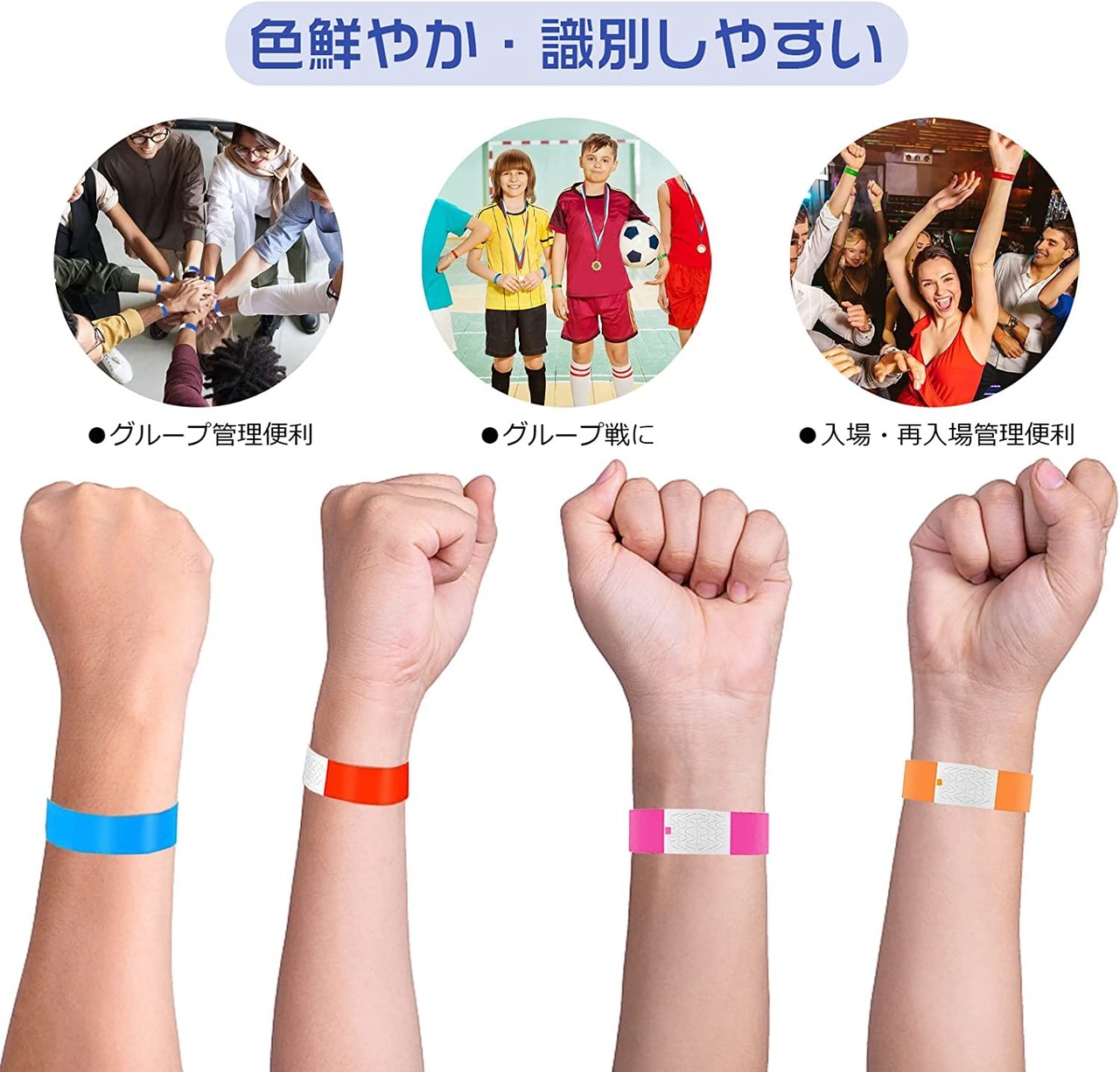 使い捨てリストバンド イベント用リストバンド 100枚 7色選択可能 防水 耐引裂き 入場 バンド テープ カラーリストバンド 人数カウント 再入場管理に ワンタッチ装着 水場でも適用 音楽ライブ 遊園地に対応