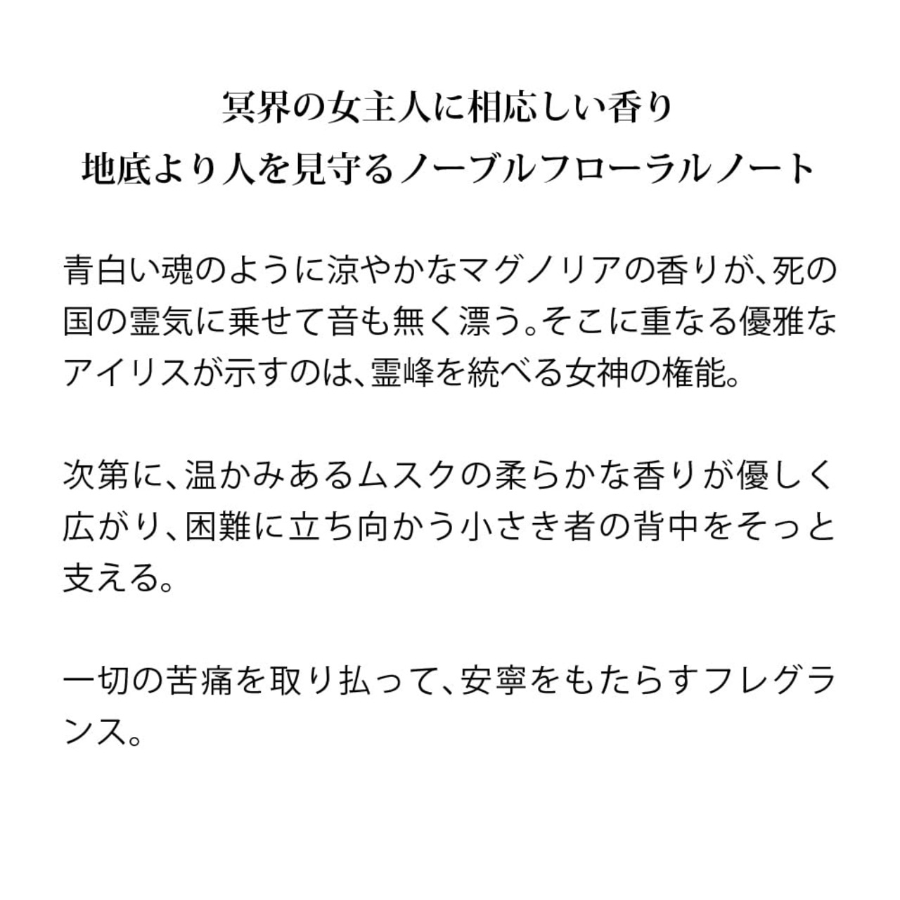 <b>■■ 冥界の女主人に相応しい香り 地底より人を見守るノーブルフローラルノート ■■ </b><BR><BR> 青白い魂のように涼やかなマグノリアの香りが、死の国の霊気に乗せて音も無く漂う。そこに重なる優雅なアイリスが示すのは、霊峰を統べる女神の権能。<BR><BR> 次第に、温かみあるムスクの柔らかな香りが優しく広がり、困難に立ち向かう小さき者の背中をそっと支える。<BR><BR> 一切の苦痛を取り払って、安寧をもたらすフレグランス。<BR><BR> TOP:Mandarin, Magnolia<BR> MIDDLE:Hyacinth, Iris, Nectarine, Violet<BR> LAST:Musk, Sandalwood, Cedarwood<BR><BR><BR> 内容量:30ml <BR> 生産国:日本 <BR> ご注意 :実際の商品と色味などが異なる場合があります。ご了承下さい。