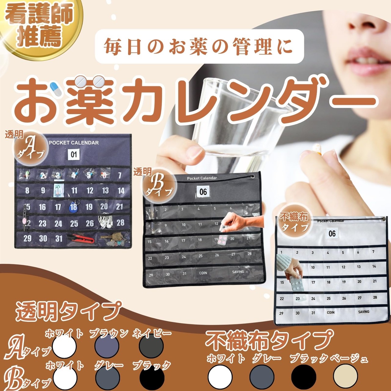 ✅【選べる2タイプ】中身が一目でわかる「透明ポケット」タイプ、プライバシーに配慮した「不織布ポケット」タイプの2種類から用途に合わせてお選びいただけます。さらに、透明タイプはAタイプ(大きな文字で見やすく、丈夫なポールタイプの支柱を採用、背面ポケット付)とBタイプ(小さめの文字で薬が見やすく、背面ポケットなしのシンプルタイプ)をご用意しました。