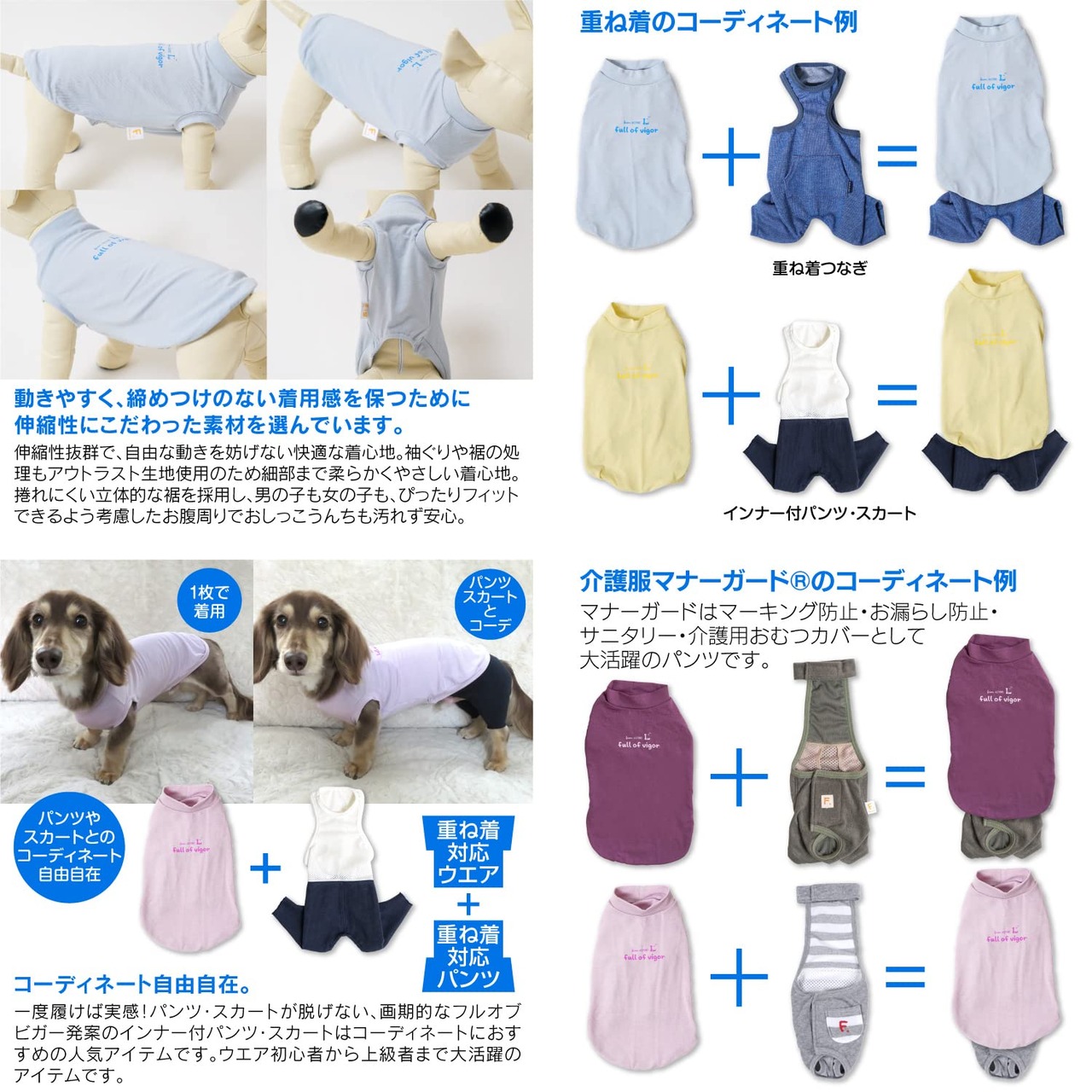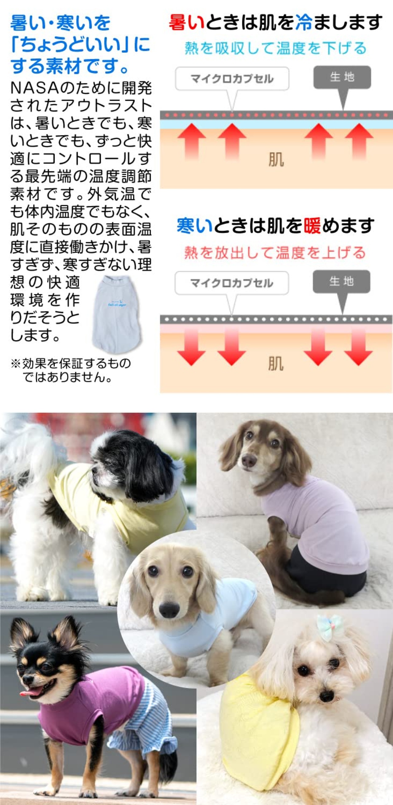 温度調整機能のあるアウトラスト素材を使用した肌触りがなめらかでワンちゃんにやさしい着用感。 伸縮性に優れ、皮膚保護・舐め対策、お部屋着にも。