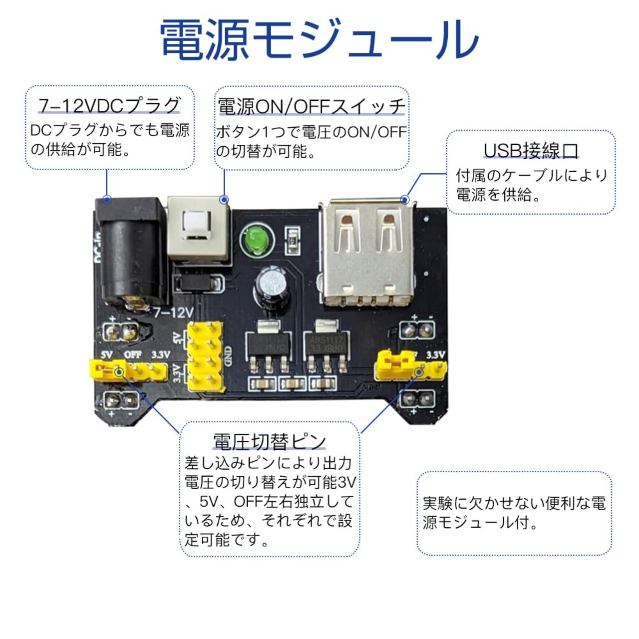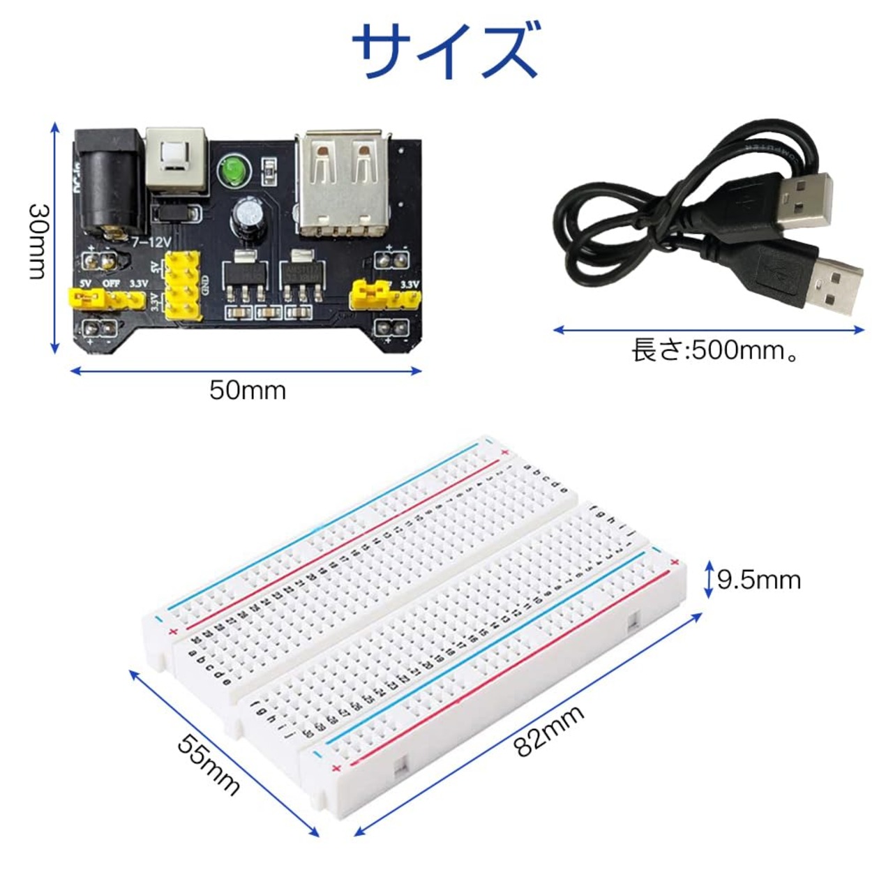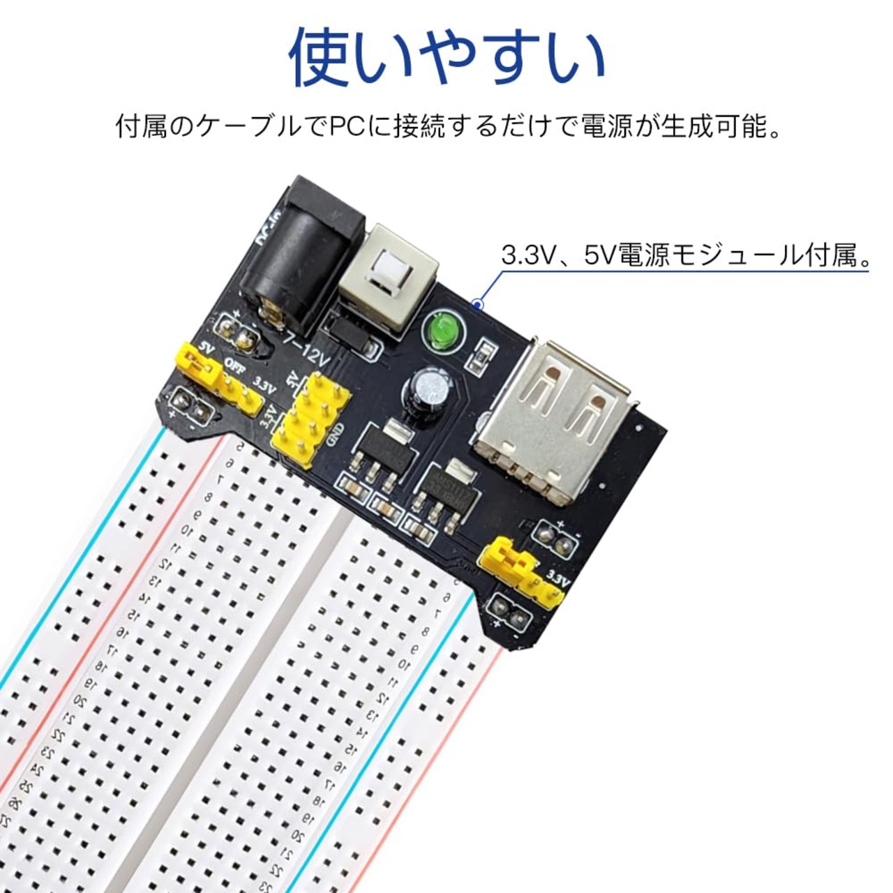 セット内容:400タイポイントブレッドボード*1個、電源モジュール付*1、USBケーブル付属*1。