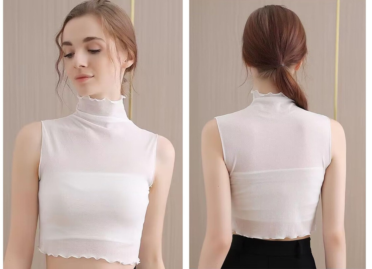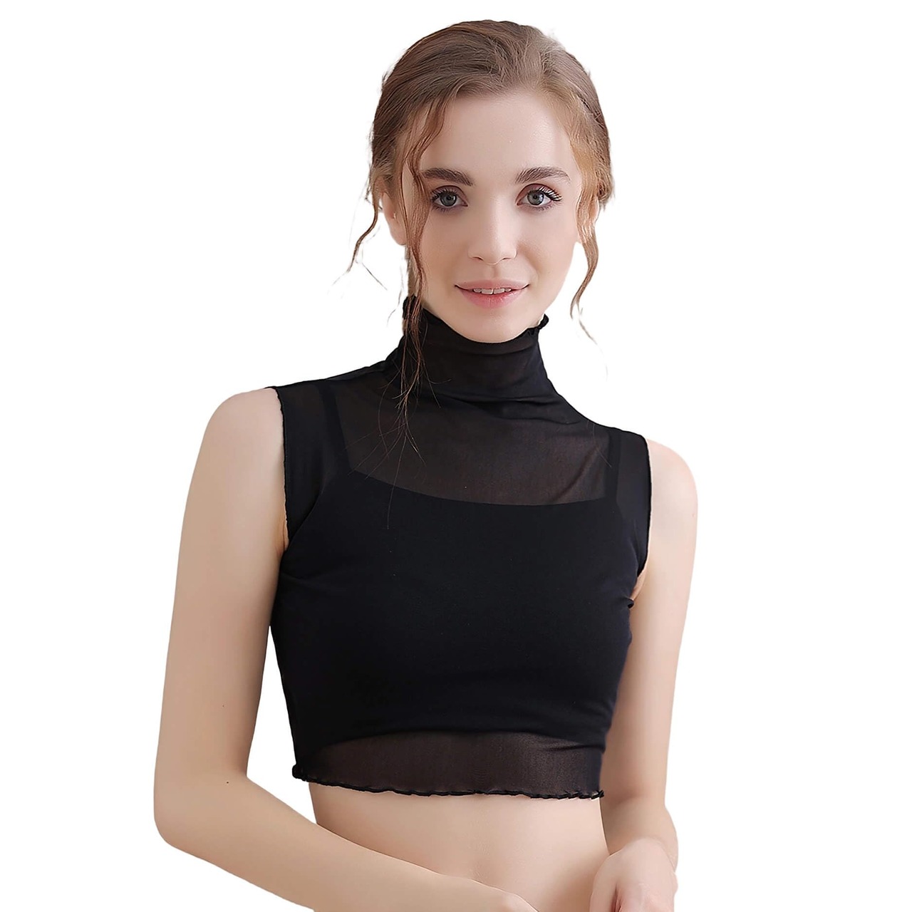 [fourfivesixはる] レディース レース インナー 胸元カバー ショート丈 タンクトップ インナーウェア ノースリーブ 短め レース インナー つけ襟 ハイネック キャミソール 女性下着 重ね着風 薄手 透け感 胸元レース シアートップス (ブラック)