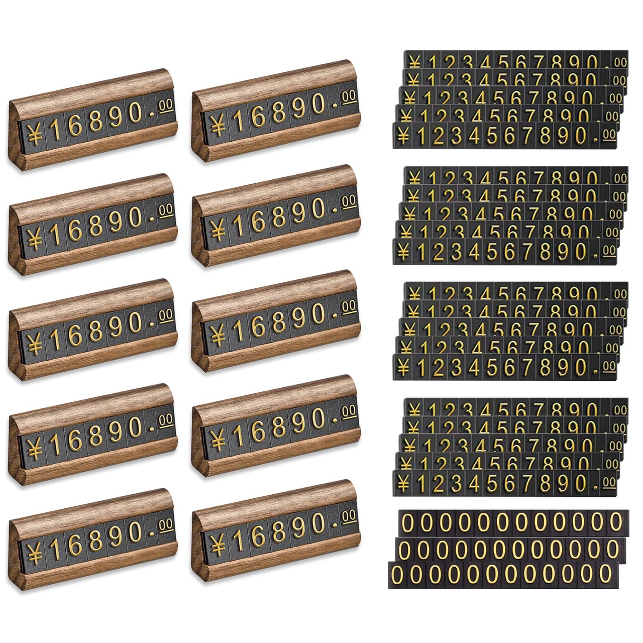 ELECTRO-WEIDEWORLD プライスカード 木製 おしゃれ 値札プレート セット プライスカード設置台10個 0-9プライスカード20本+0プライスカード3本(総計36個)付き プライスキューブ プライスタグ 価格表示 店舗 プライスキューブ ディスプレイ 万の値まで表示可能 (黒胡桃材/金文字,台座10個セット)