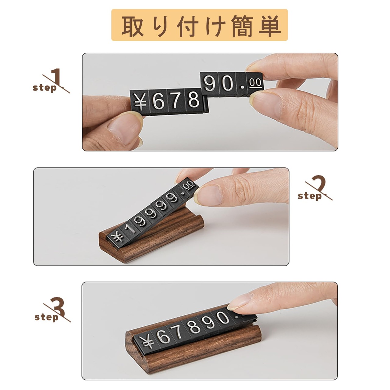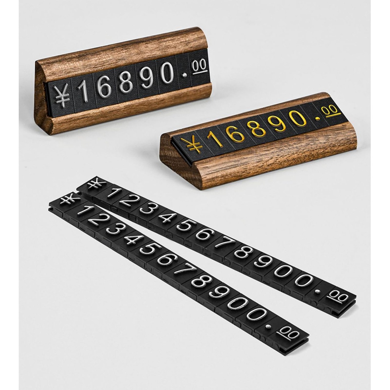 【製品詳細】底座:黒胡桃材/ブナ材、6.5cm (幅)× 2.5cm(高)。プライス数字プレート:ABSプラスチック、単体:0.8(幅)*1.2CM(高)。