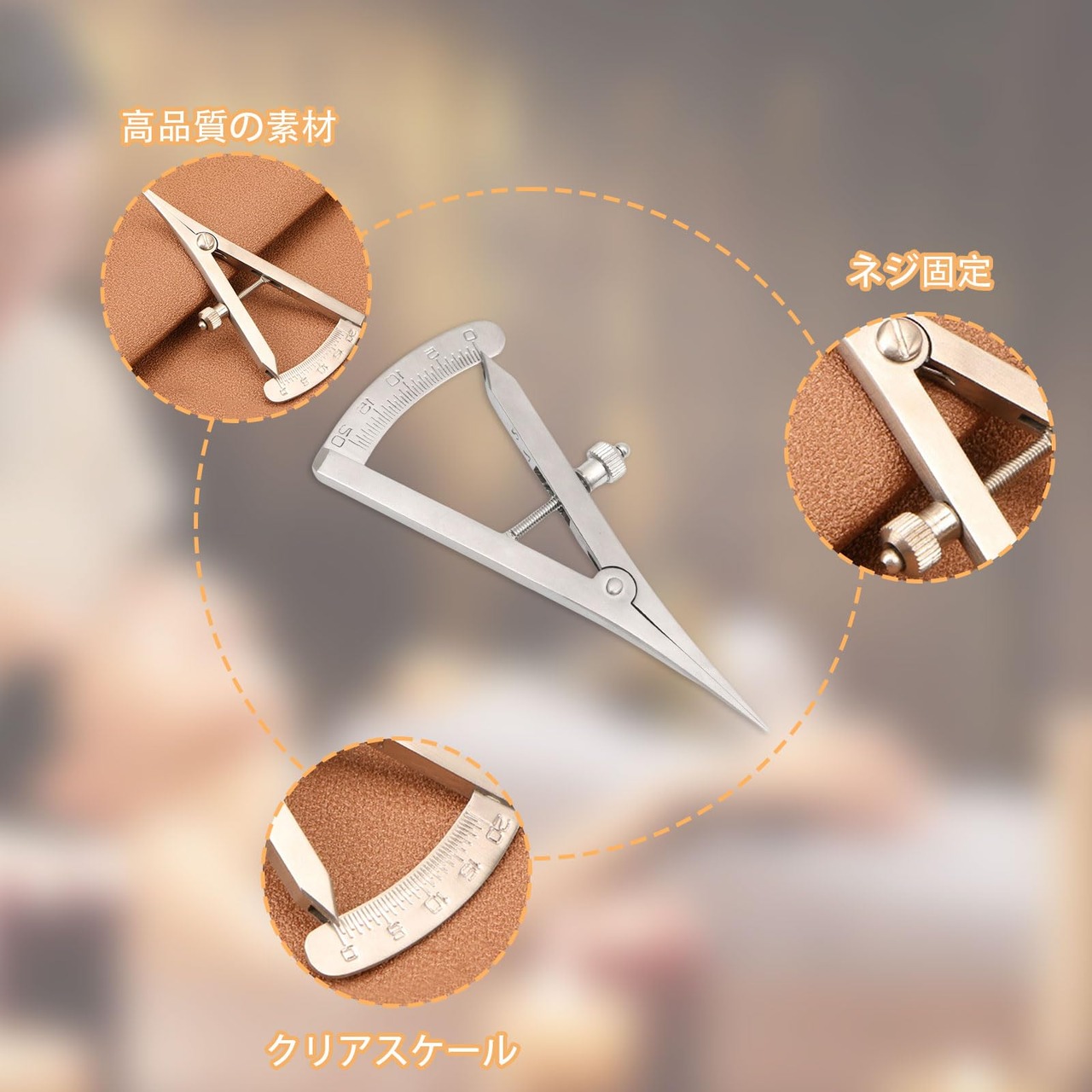 【パッケージ】測定工具1個。長さ8.5cm。 【材質】高品質のステンレス鋼で作られ、硬度が高く、錆びにくく、長寿命です。 【ネジ式】ネジで距離を調整でき、希望の位置にしっかりと固定できるので正確な測定が可能です。 【ポータブル】小型で軽量、保管や持ち運びが簡単です。 【幅広い用途】レザークラフトや手芸の円弧、円、ゲージ、分割線、線分、寸法測定などの作図作業に使用でき、木工、金属加工にも使用できます。