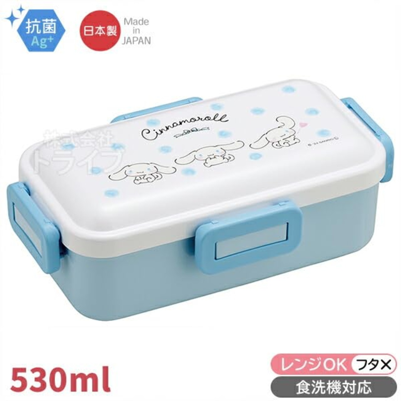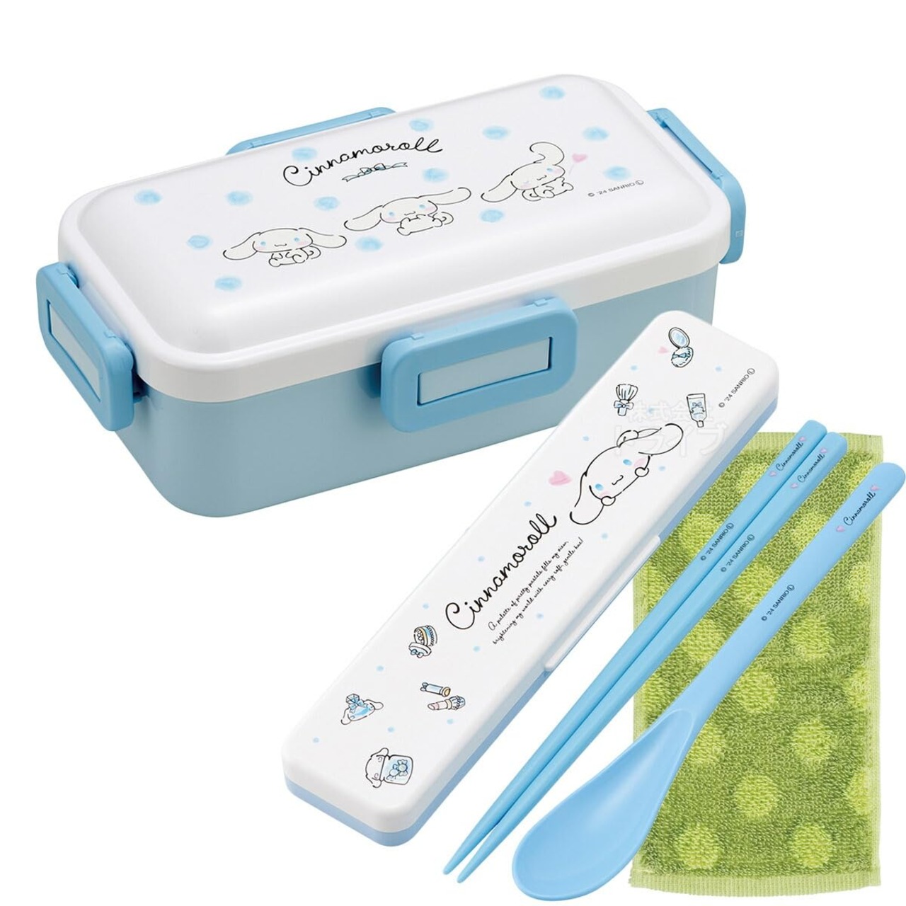 シナモロールのお弁当箱セットです。4点ロックのお弁当箱は、しっかりフタが出来るので汁漏れも安心◎単品で買うよりもお買得なセットをこの機会に是非どうぞ!<br><br>〔4点ロックお弁当箱〕食洗機対応<br>フタを外して電子レンジ対応<br>仕切付<br>日本製<br>抗菌約18.6×10.8×6.2cm<br>容量=530ml<br><br>〔音の鳴らないコンビセット〕<br>抗菌・食洗機対応<br>日本製<br>約18.8×4.7×1.8cm<br>箸・スプーン=18cm<br><br><br><br>