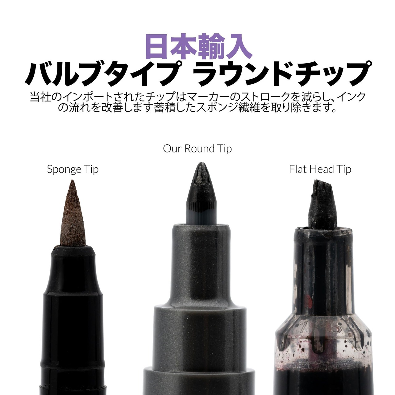 改良されたバルブタイプの丸型チップ:改良されたバルブタイプの丸型チップを搭載しており、滑らかなインクフローを確保し、マーカーストロークを減らし、スポンジ繊維の蓄積を防ぎ、毎回プロフェッショナルな仕上がりを実現します。