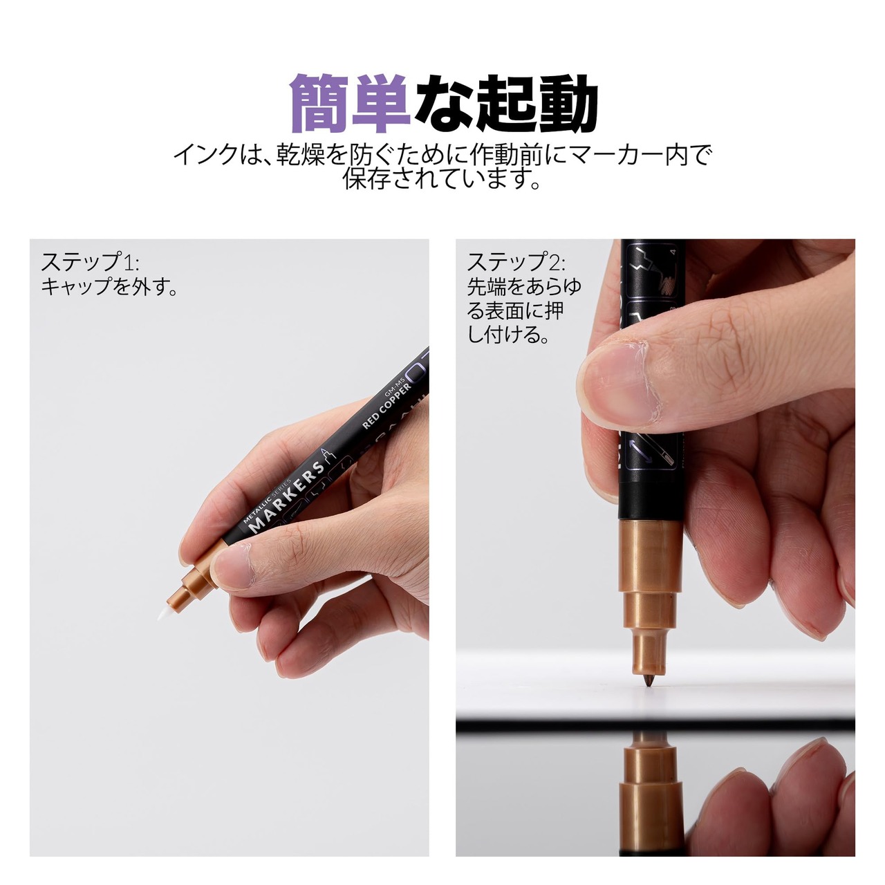 簡単に使用可能:インクはマーカー内部に保管され、必要な時にのみ活性化されるため、早期の乾燥を防ぎ、使用時にはすぐに利用できる状態が保たれます。滑らかで均一なカバーを実現し、他のブランドに比べて優れた性能を発揮し、完璧なメタリック効果を提供します。