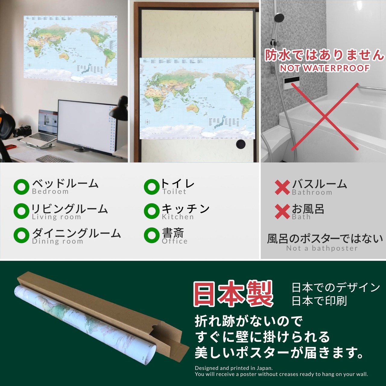 日本製&折り目なし配送。当地図は日本でデザイン・印刷されており品質と細部へのこだわりが配慮されています。巻いた状態で発送することで、届いてすぐに展示できる美しいポスターをお届けいたします。