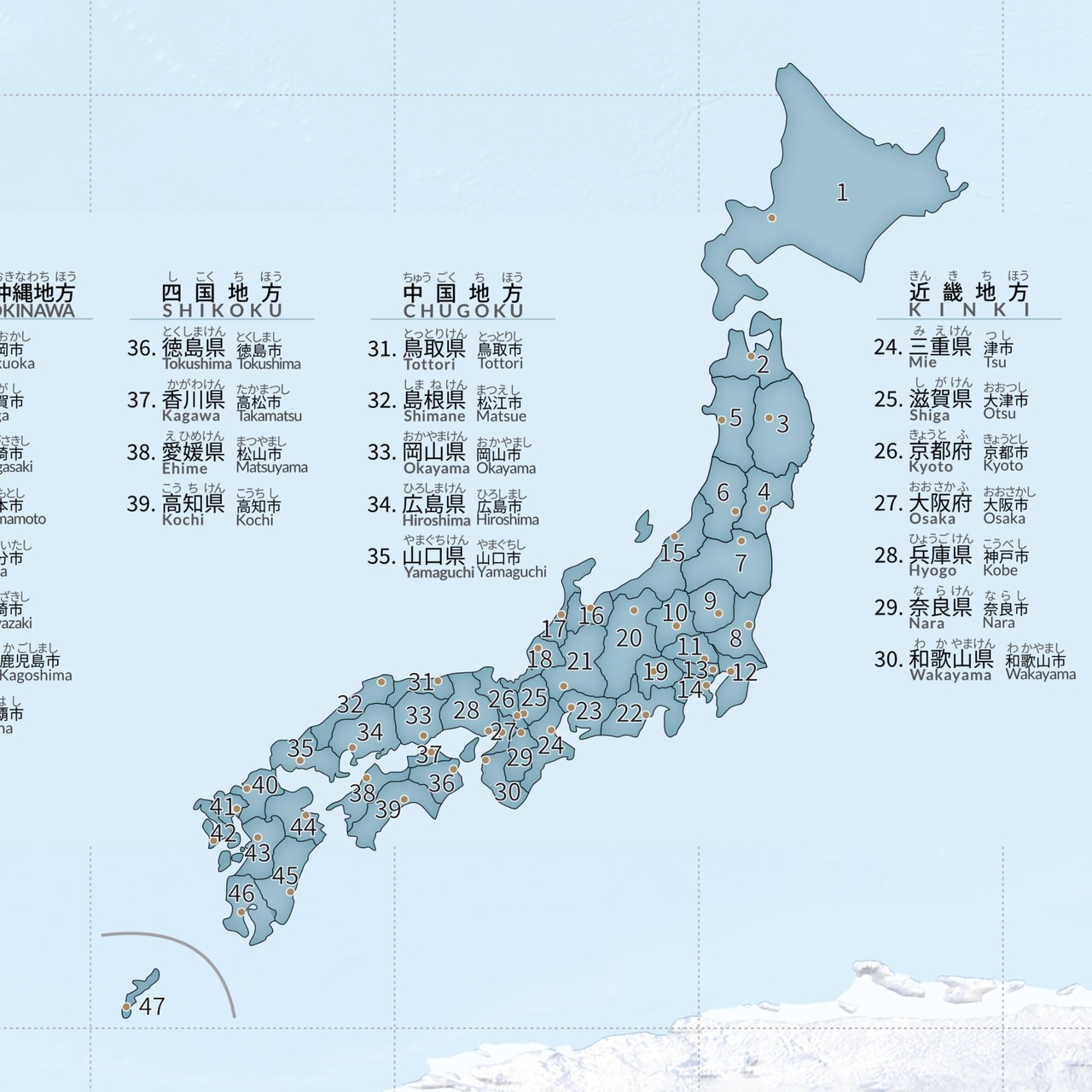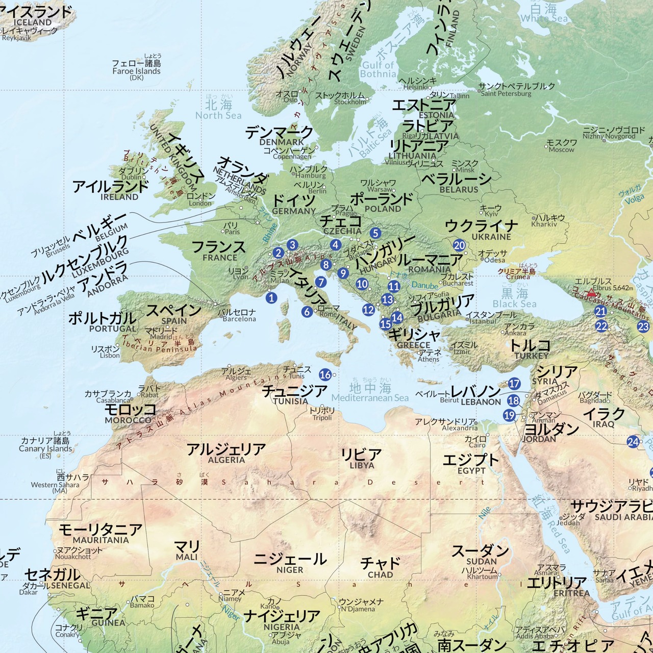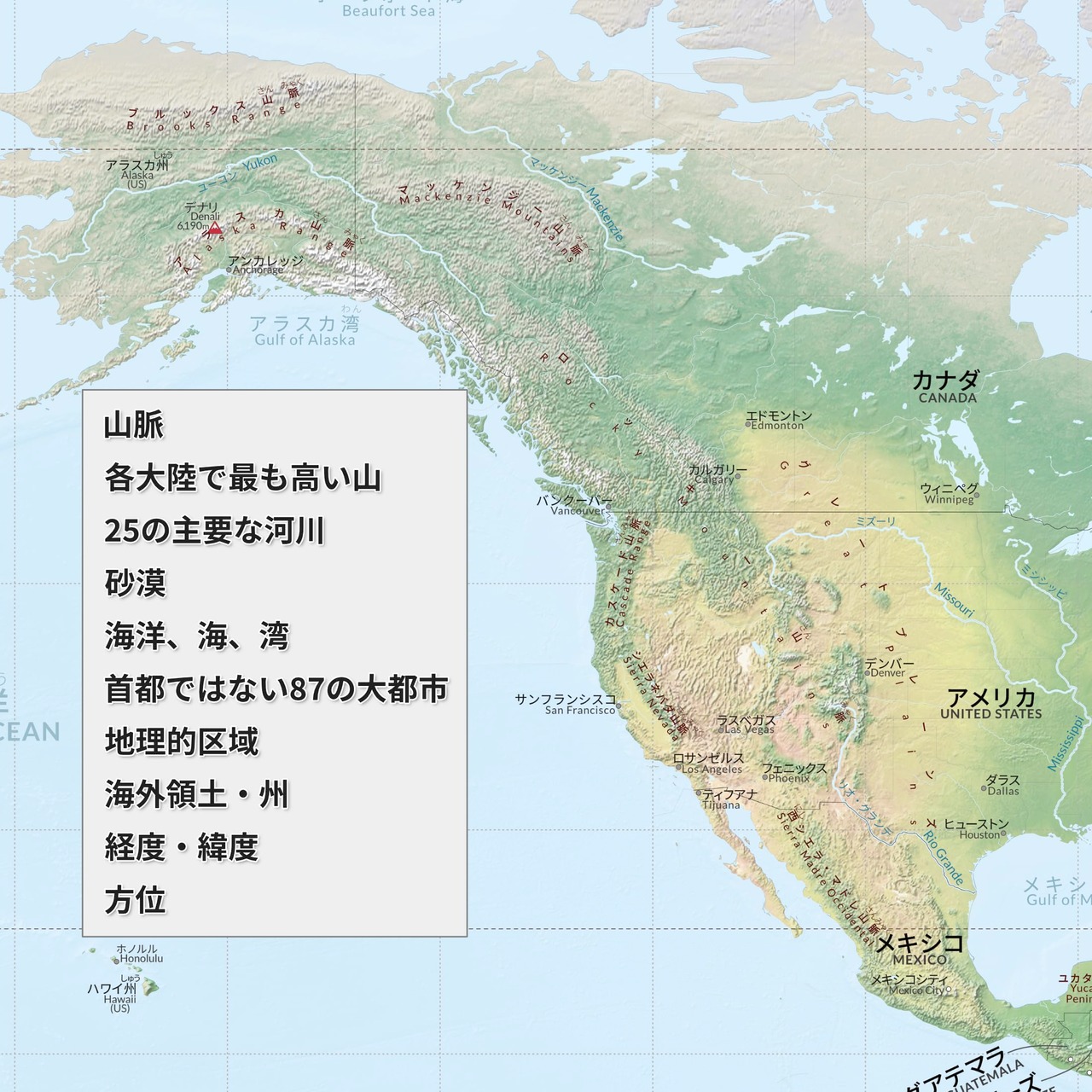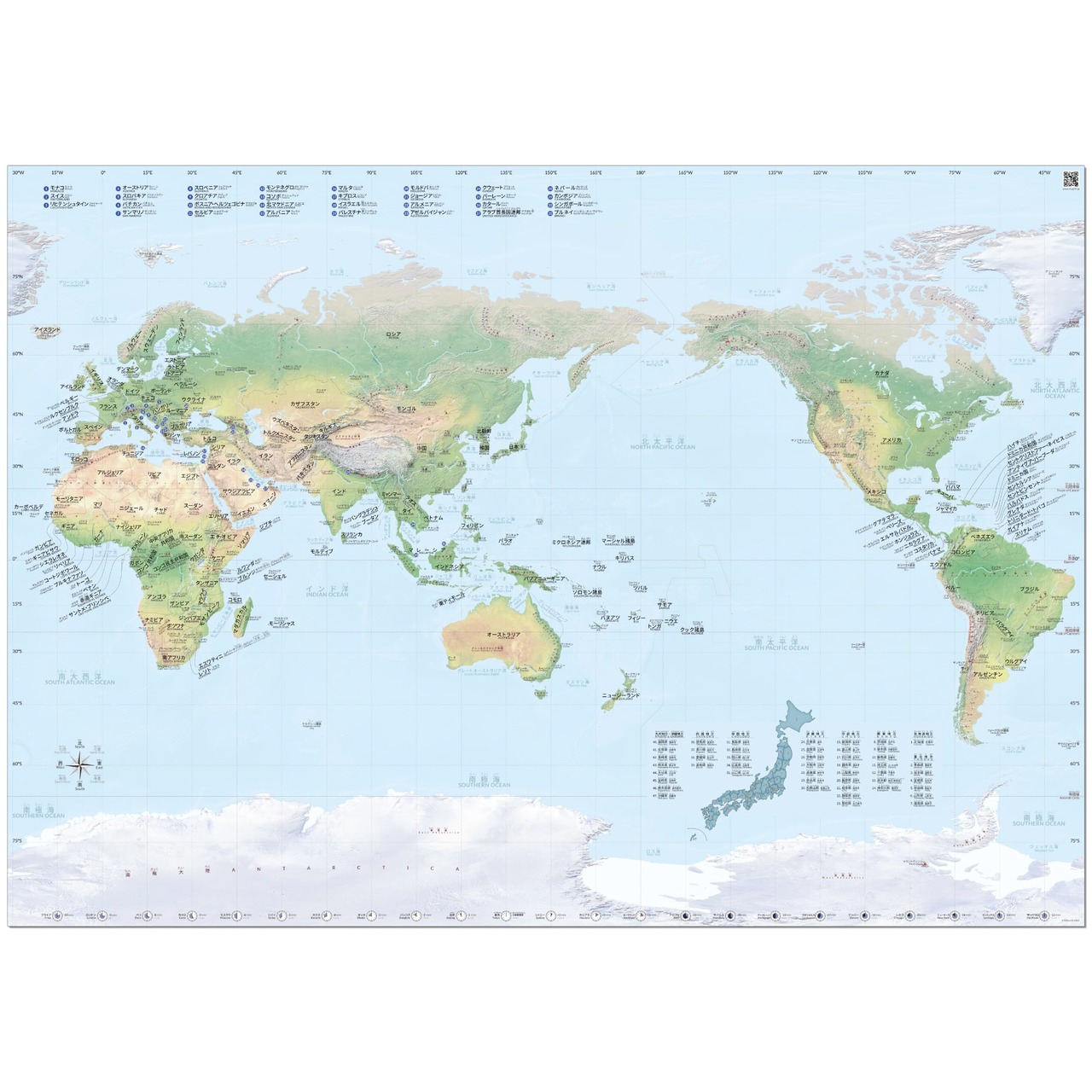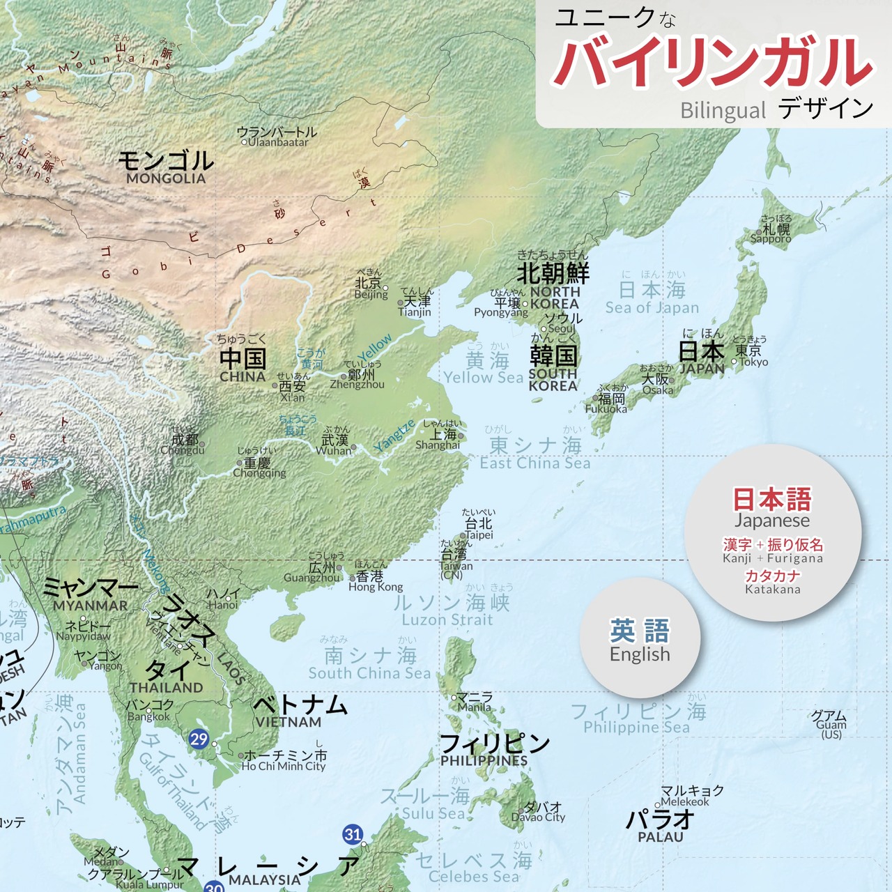 英語と日本語のバイリンガル世界地図ポスター。国名・都市名・海名・山名・川名・日本の都道府県名・日本の地域区分名を日本語(カタカナやふりがな付漢字)と英語で表示しています。