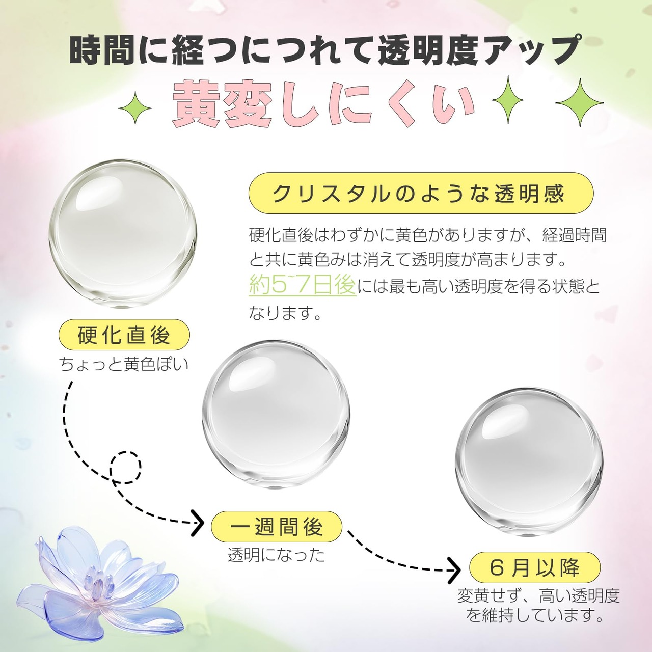 【高い透明度& 黄変にくい】AOZORAのレジン液は水のような透明さを持ちます。着色剤との相性も優れており、発色は非常に鮮やかです!作品を完璧に表現することができます。また、黄変性能も優れています。長時間使用しても新しいような透明さを保ち、あなたの作品の魅力を長く引き立てます。