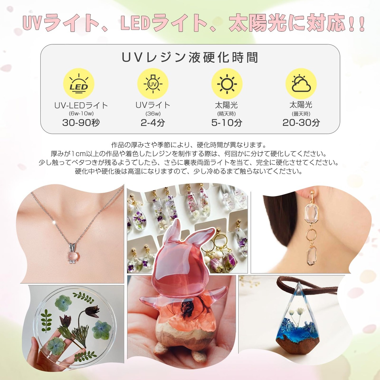 【 粘度が適当で使いやすい】UVレジン液の粘度は1000cpsです。型に入れやすいです。さらに重要なのは着色剤との相性も抜群です、鮮やかな色彩を実現できます、初心者でも簡単に使用。ネックレス、ペンダント、イヤリング、キーホルダーなど、好きな人のためにきれいなアクセサリーを作ることができます。