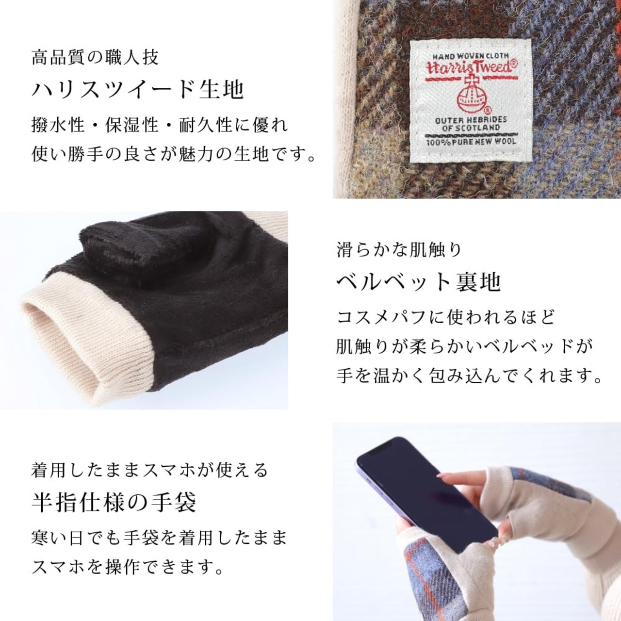 【商品詳細】<br> <br> スコットランドにあるハリス地方で織られ、ハリスツイード協会による検査をパスした生地のみを「ハリスツイード」と呼び、その証明としてオーブ(王冠)マークの入った協会認証ラベルが与えられます。<br> 丈夫で美しい発色のハリスツイードは、100年以上の伝統を持ち、長年にわたり世界中で愛されています。<br> <br> 手の甲部分に取り付けられたオーブマーク付きのラベルは、手甲のハリス生地は本物のHarris Tweedの証。上質な素材と技術により、外観だけなく、肌触り、温かさも抜群の逸品。<br> <br> ◎当店アパレルブランドの「アッティーヴォ」とスコットランド発の最高級「ハリスツイード」生地を使用した半指手袋です。<br> <br><br> ■高品質の職人技【ハリスツイード生地】<br> 撥水性・保湿性・耐久性に優れ、使い勝手の良さが魅力の生地です。<br> <br> ■滑らかな肌触り【ベルベット裏地】<br> コスメパフに使われるほど肌触りが柔らかいベルベットが手を温かく包み込んでくれます。<br> <br> ■着用したままスマホが使える【半指仕様の手袋】<br> 寒い日でも手袋を着用したままスマホを操作できます。<br> と、可愛らしいラビットファーが施された指なしグローブです。<br> <br><br><br> 【ご使用上の注意事項】<br> <br> ■汗や摩擦により他のものを汚染することがあります。<br> ■火に近づけないでください。<br> ■アイロンの使用はお避け下さい。<br> ■温度・湿度の低いところに保管し、定期的な換気を行ってください。<br> <br><br><br> 【商品のカラーについて】<br><br> 掲載写真に関しましては、お客様のご覧になられますパソコン機器やモニタの違い、また室内及び室外での撮影環境等により実際の商品のお色と相違する場合がございます。あしからずご了承くださいませ。