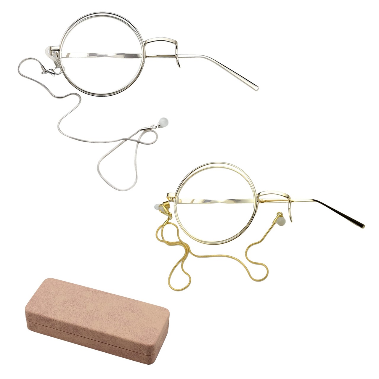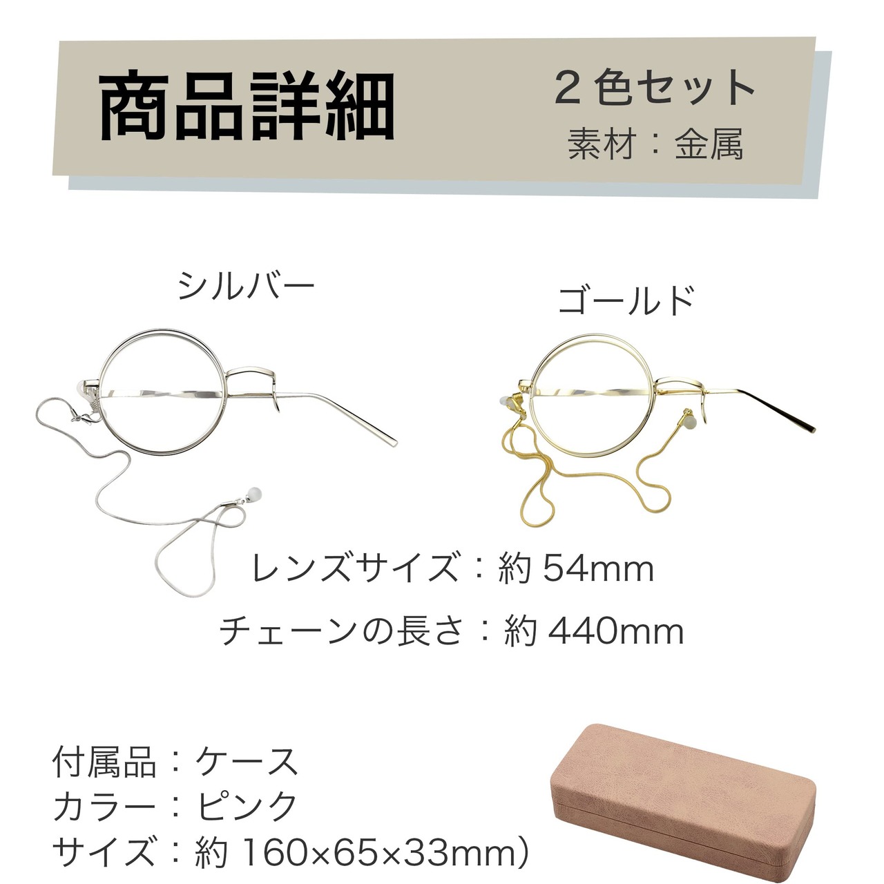 セット内容:2色セット サイズ:フリーサイズ 素材:金属 カラー:シルバー、ゴールド レンズサイズ:約54mm チェーンの長さ:約440mm 付属品:ケース(カラー:ピンク サイズ:約160×65×33mm) ※モニターの環境等により、色の見え方に若干差が生じる場合がございます。