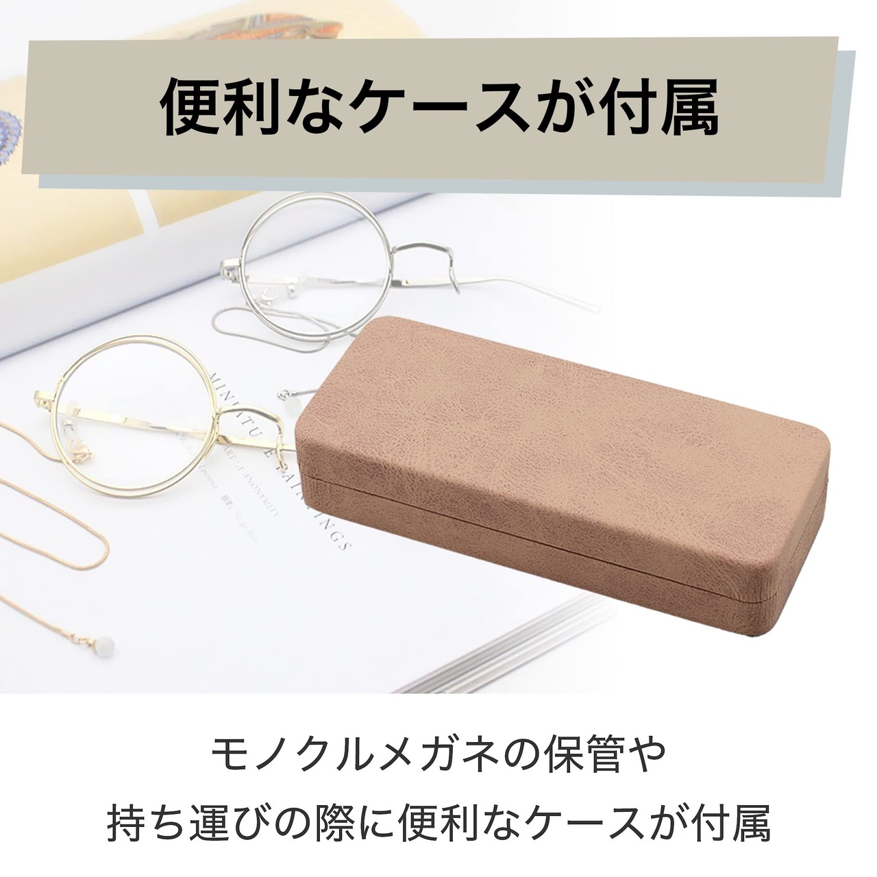 便利なケースが付属:こちらのモノクルメガネには、ピンクのケースが付属しています。モノクルメガネの保管や持ち運びの際に便利で、通常のメガネケースとしても日常的にご活用いただけます。
