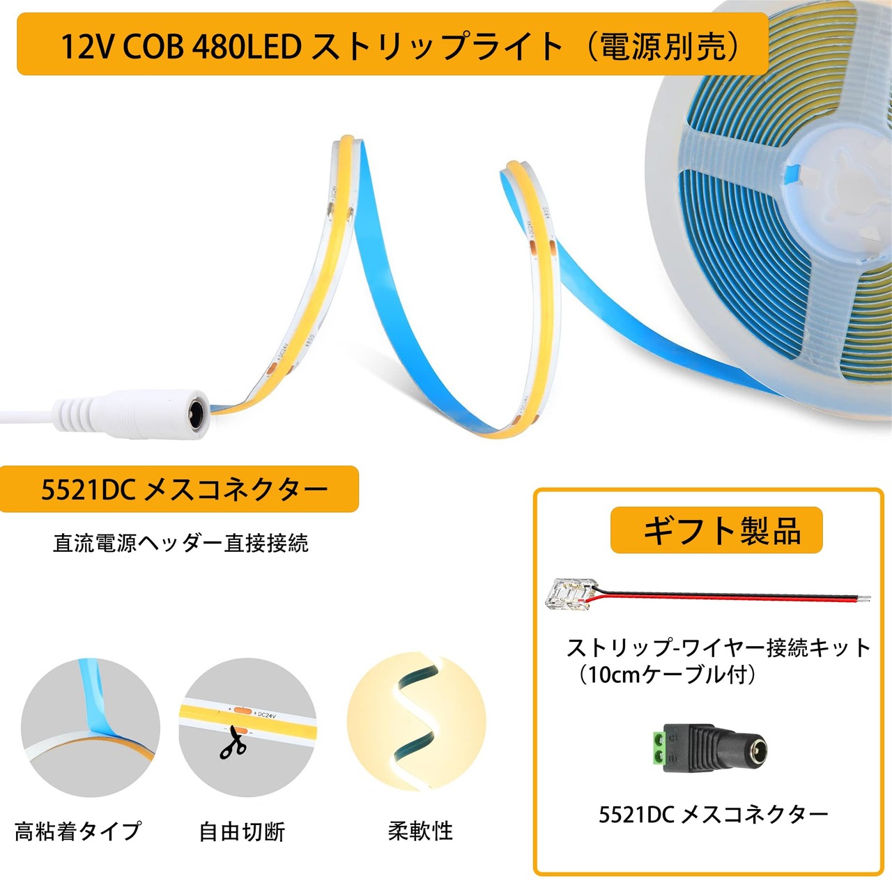【480LEDストリップ】 Clearhill 12V COB 480LEDストリップライトは、高密度LEDチップを採用。従来のSMDライトストリップと比べ、先進的なCOB集積パッケージ技術により1メートルあたり480LEDを実現。高密度でシームレスな均一照明を提供し、光のムラや眩しさがなく、目に優しい柔らかな光です。※電源アダプターは付属しません。