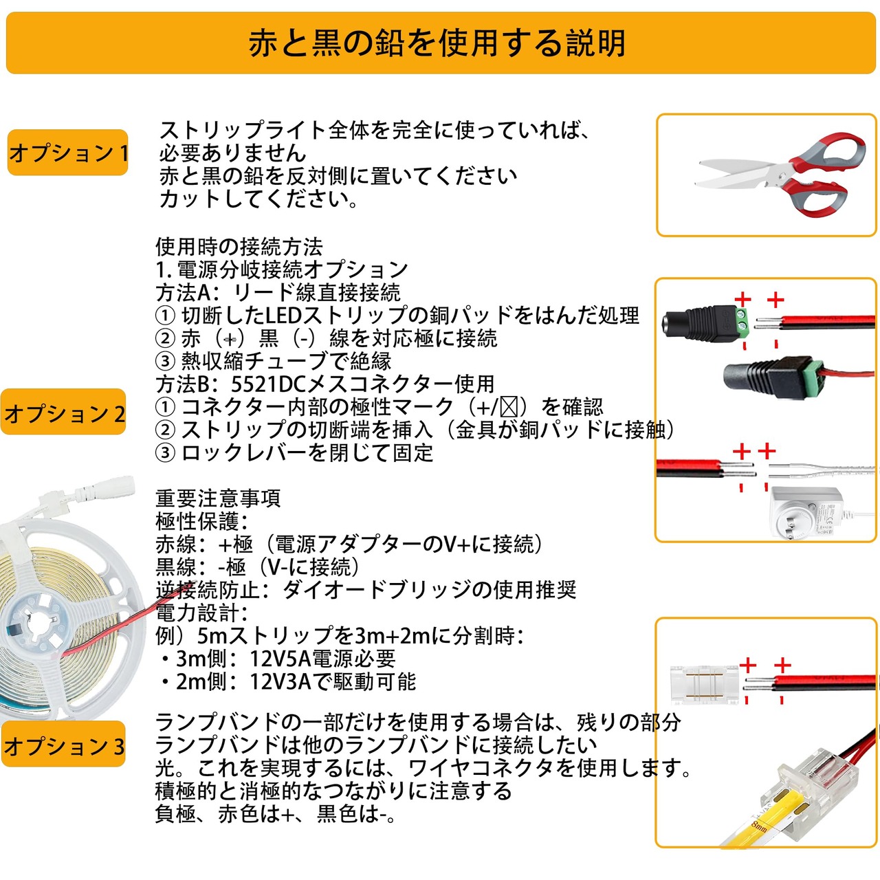【12V入力】 Clearhill 12V COB 480LEDストリップライトは5521DCオスコネクター付き。安全な12V低電圧で触れても感電リスクがありません。電源アダプター(別売)に簡単接続可能。2m/3m用には12V 2A 24W、5m用には12V 3A 36Wの電源推奨。