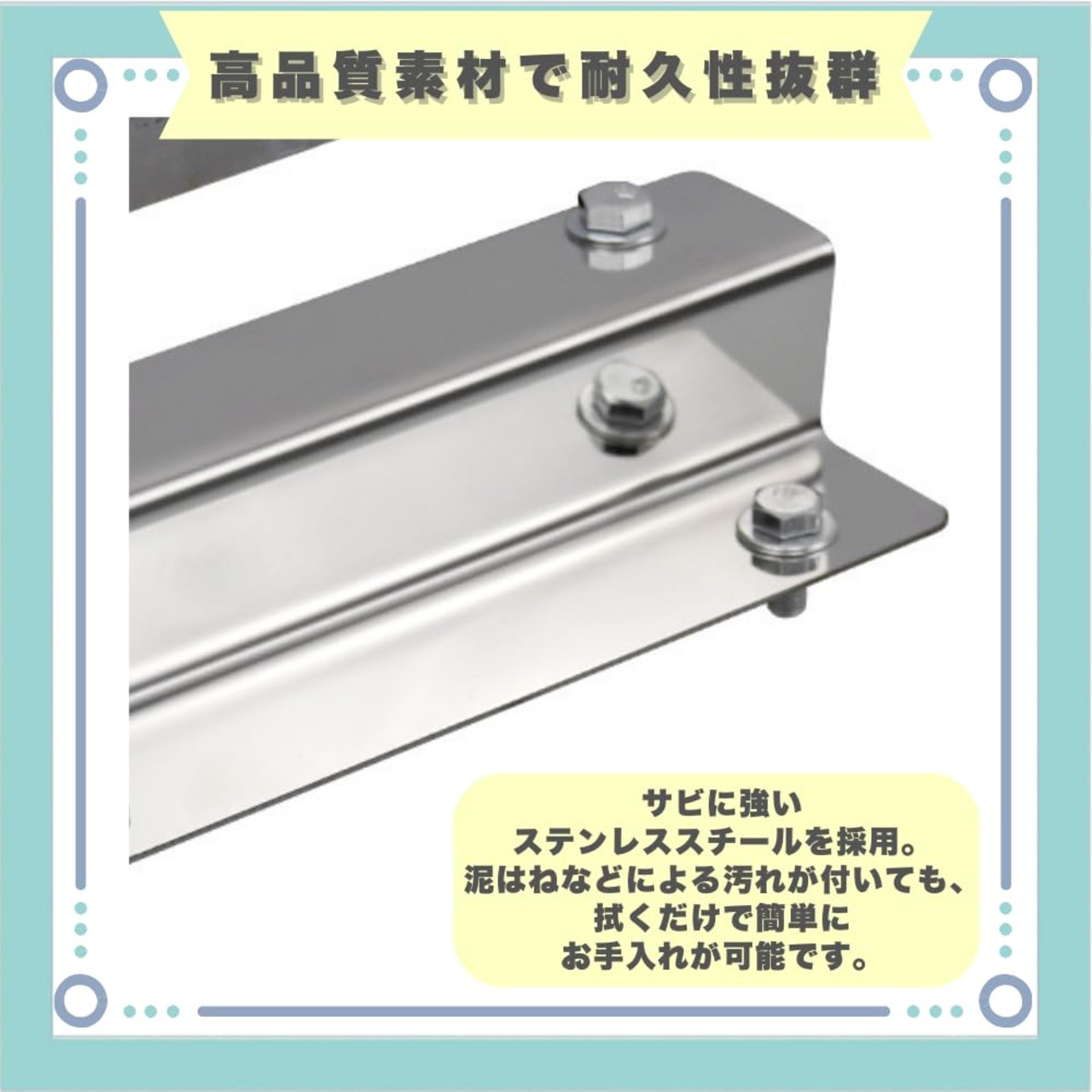【高品質素材で耐久性抜群】サビに強いステンレススチールを採用。泥はねなどによる汚れが付いても、拭くだけで簡単にお手入れが可能です。