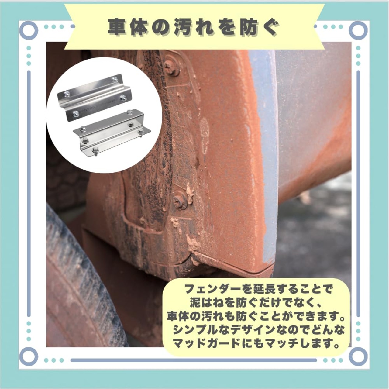 【高品質素材で耐久性抜群】サビに強いステンレススチールを採用。泥はねなどによる汚れが付いても、拭くだけで簡単にお手入れが可能です。【車体の汚れを防ぐ】フェンダーを延長することで泥はねを防ぐだけでなく、車体の汚れも防ぐことができます。シンプルなデザインなのでどんなマッドガードにもマッチします。【取り付け簡単】特別な技術は不要で、付属のネジを使うだけで初心者の方でも簡単に装着可能です。【幅広い適合車種】ハイゼット、ピクシス、サンバートラックなど、幅広い車種に対応可能です。【安心の返品・返金保証】万が一商品にご満足いただけない場合、商品到着から30日間返品・返金対応させて頂きます。 また、お困りごとがございましたら、メールサポートにて24時間日本人専任スタッフが対応致しますので、ご安心してお買い求めください。