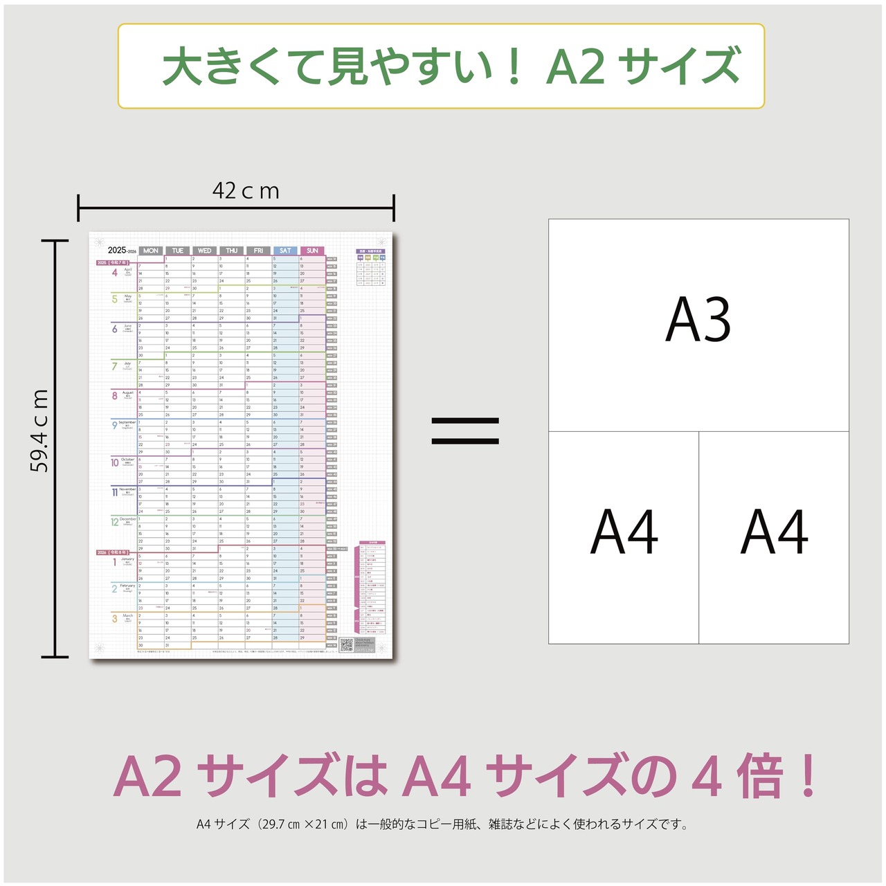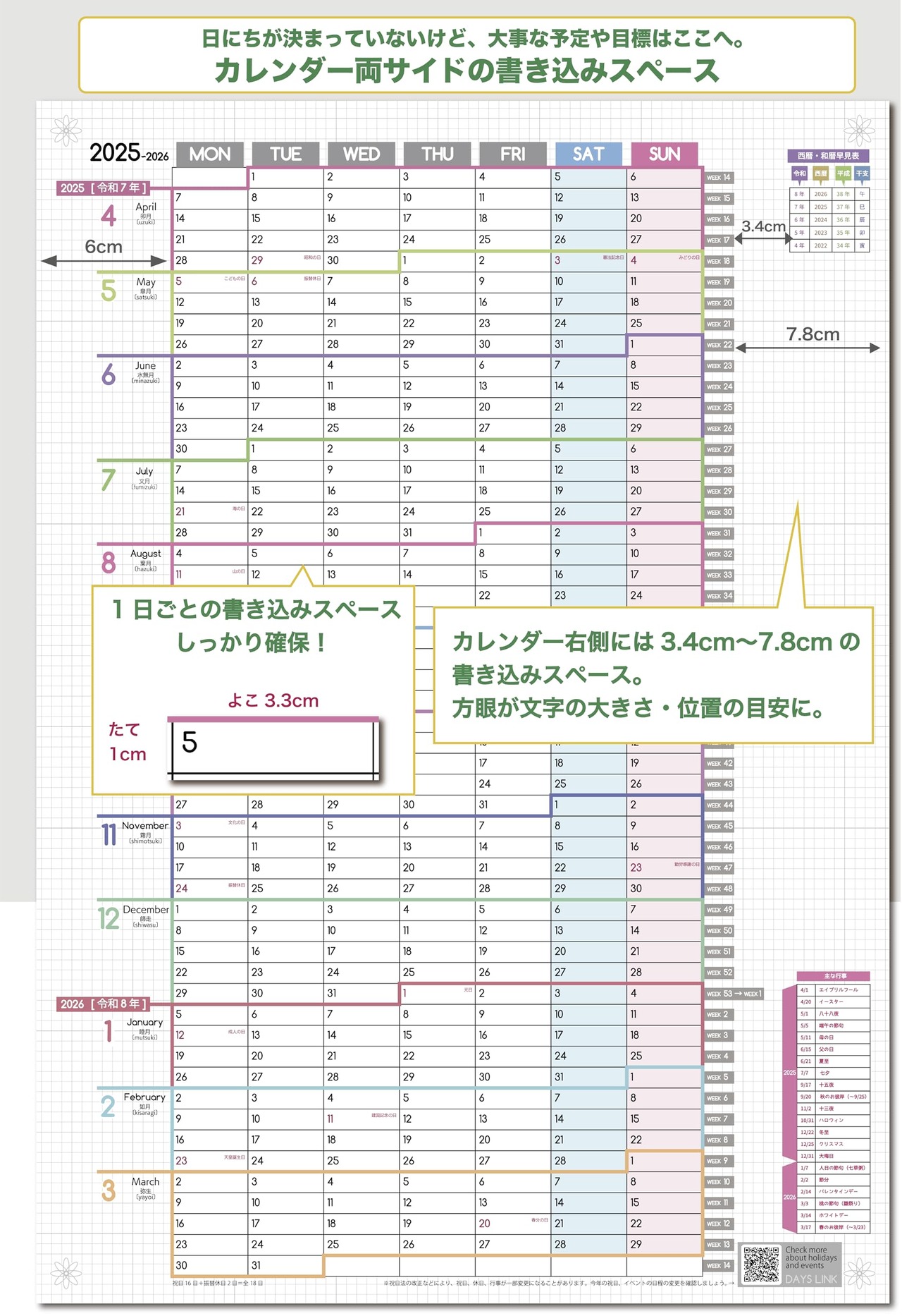 DAYS LINK 1年連結カレンダー ポスター 1枚 (2025年 4月始まり 月曜始まり) 大きい 壁掛け 令和7年 1Y-25-04MON (パステル, 標準(A2))
