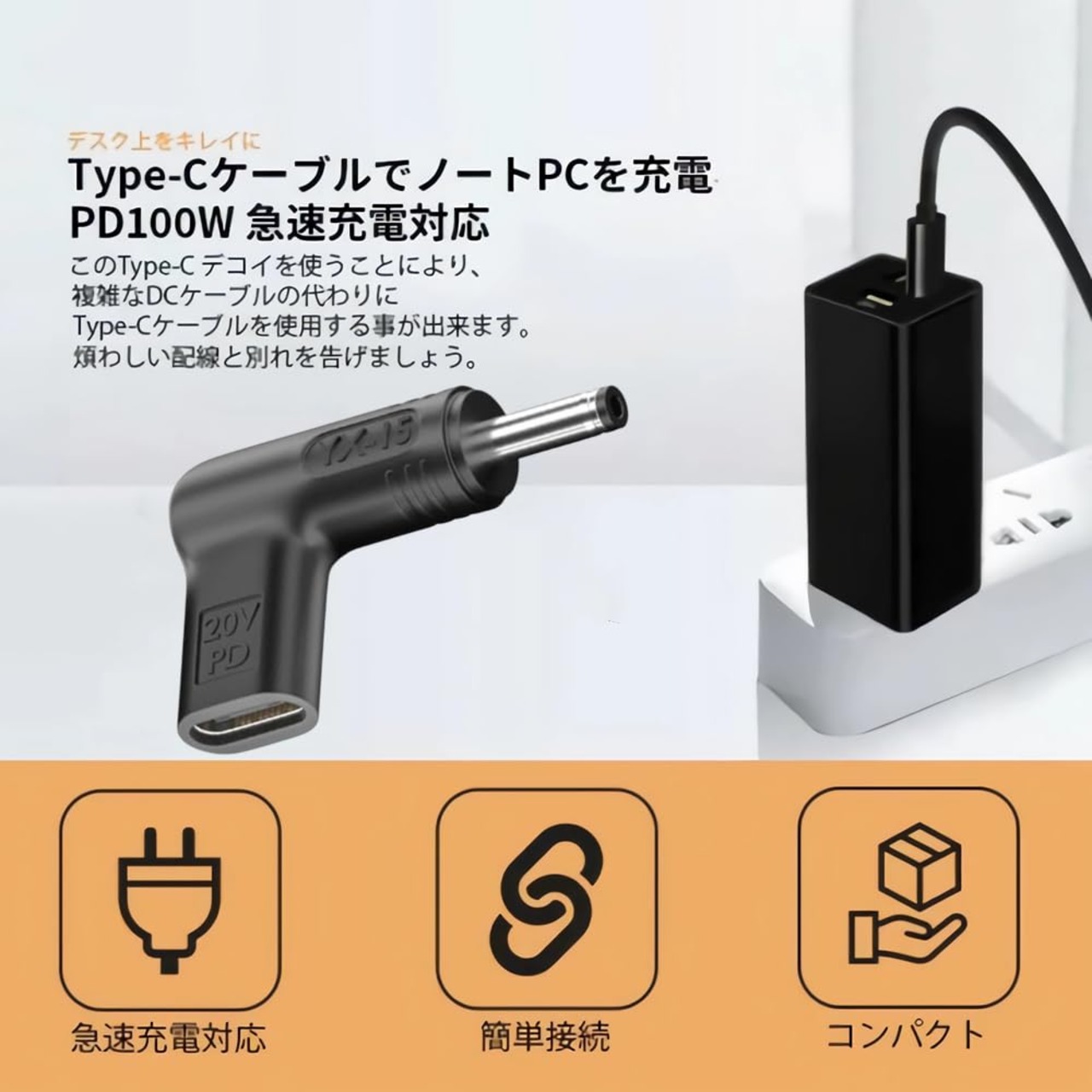 【入力】:TYPE-Cメス 45~100WのPD充電器、【出力】: 外径4.0mm、内径1.35mm(オス) (20V)