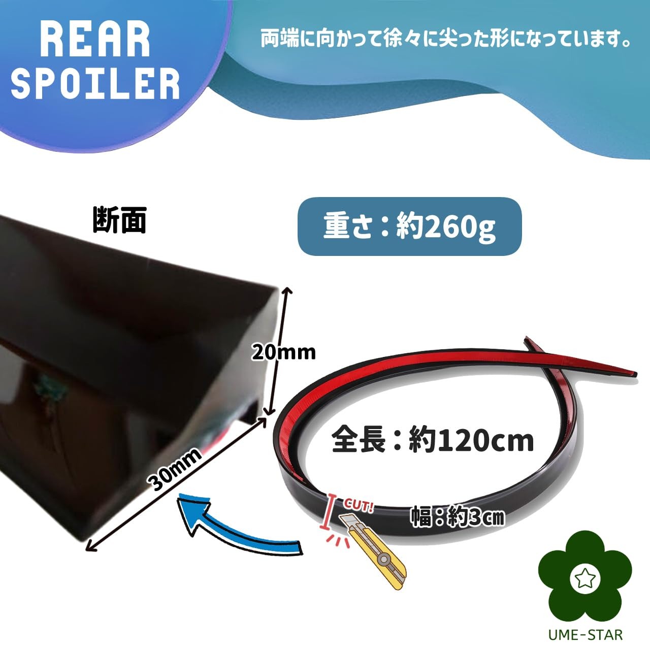 両面テープで簡単に取り付けられる汎用リアスポイラーです。 全長120㎝で、高強度の柔らかいゴム素材でできており、カッターでカットしてリアのサイズに合わせてお使いいただけます。