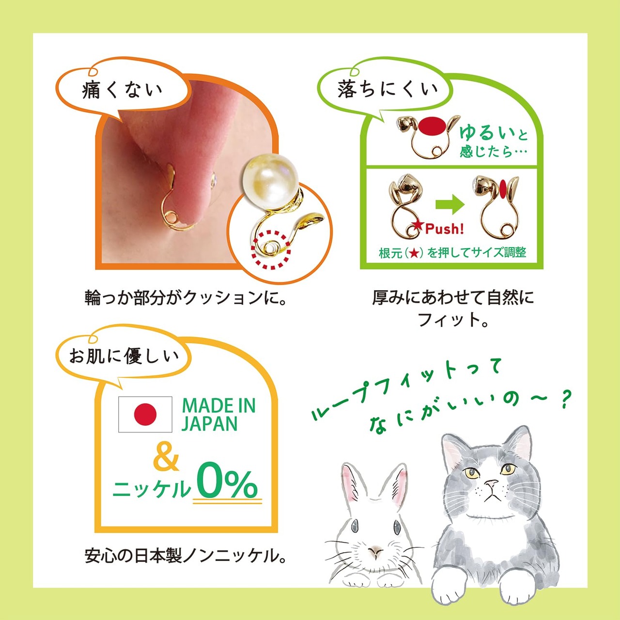 【商品説明】<br> 1日つけても痛くならない、<br> 新感覚イヤリング「ループフィット」<br><br> ウサギやネコなど、かわいい動物の<br> 台紙につけてお届けいたします。<br><br>【ループフィットとは】<br> 「耳から落ちにくい」のに「痛くなりにくい」<br> 新感覚のイヤリングです。<br><br> 独自のバネが優しく耳を包むので、<br> 長時間お使いいただいてもほぼ痛くありません。<br> (個人差があります)<br><br> 尚且つ、強いホールド力を持ち、<br> 耳から落ちにくくなっています。<br><br> ノンニッケルなので金属アレルギーの方でも<br> 安心して、着用いただけます。<br><br> ※耳たぶの薄い方は取れやすくなる場合がございます。<br>  留め具の開きサイズをお確かめの上ご購入ください。<br><br> ※取れやすい場合はループを指でつまんで開き口を<br>  小さくすると取れにくくなります。<br><br> ※激しい動きや運動をする時などは<br>  取れやすくなる場合がございます。<br><br> 【ご注意】<br> 体質によって皮膚に異常を感じた時は、<br> 直ちにご使用をおやめいただき、専門医にご相談ください。<br><br> なお、サウナ等、高温な場所で貴金属を着けていますと<br> 火傷の原因となる場合がございますので必ず外してください。<br><br> ※掲載画像は実物と同じ色合いを<br>  再現するようにしておりますが、<br><br>    画面上と実物では多少色具合が異なって見える場合も<br>  ございますので、予めご了承ください。<br><br>