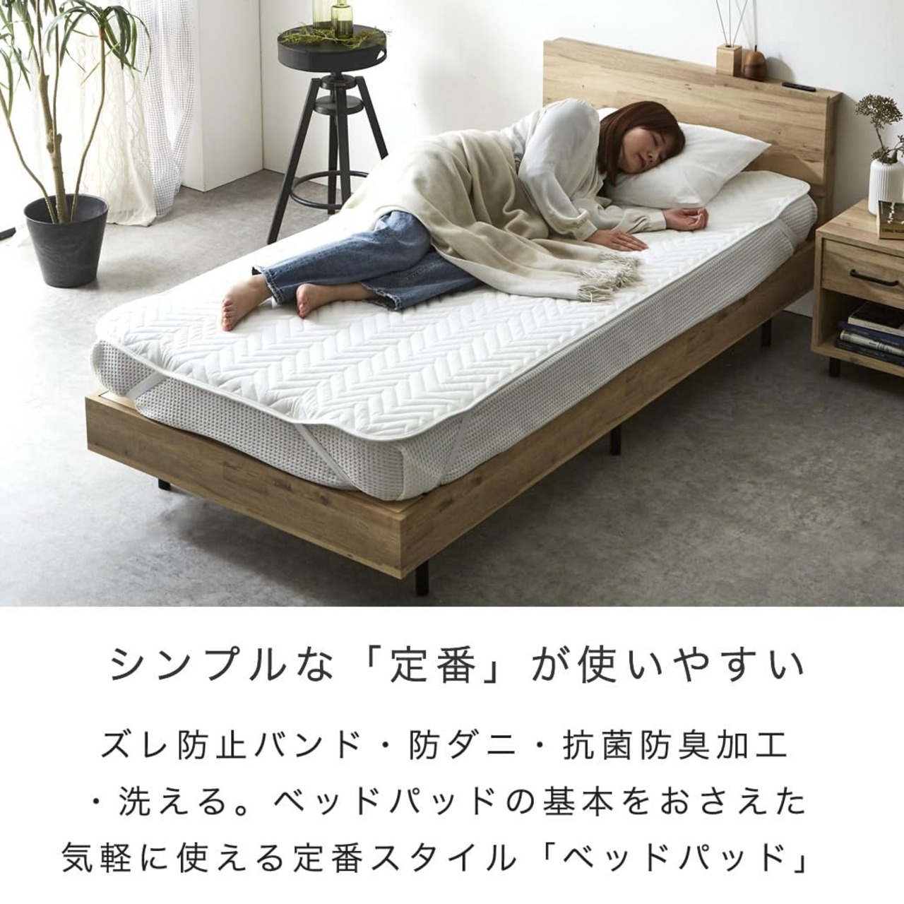 毎日の睡眠のお供に。定番スタイルのベッドパッドです。防ダニ・抗菌防臭加工中綿を使用。ズレ防止の四隅のゴムバンド付きで快適に使用できます。シンプルなデザインで、手軽に使用しやすい定番ベッドパッド。ご家庭の洗濯機で洗えて、お手入れも簡単。いつも清潔で快適な眠りへ。■サイズ(約):幅160 ×長さ195cm ■材質:・側生地:ポリエステル65%、綿35%・中綿:ポリエステル100%(防ダニ・抗菌防臭加工) ■組立:完成品 ■生産国:中国 ■備考:・四隅ゴム ・ご家庭の洗濯機でお洗濯できます。※洗濯ネットをご使用ください。