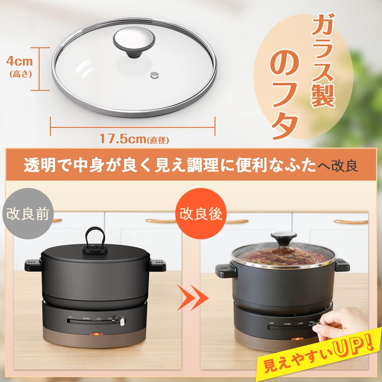 【温度調整機能】電気鍋は4段階の温度目盛「保温、低、中、高」、本体下部のレバーをスライドさせれば、65~250℃までスムーズに温度を調節可能です。メニューに合わせて温度を調整し、1人鍋は加熱ムラが出にくい、ラーメンとスープなどの料理がもっと美味しいです。(1L水沸騰までの目安時間:10~15分)