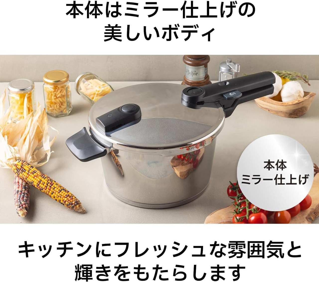 【設計】蒸気が少なく、音も静かなフィスラーの圧力鍋。正しくロックされない限り圧力がかからない安全仕様、より大きくつかみやすい形状になった補助取っ手、高品質ステンレスを使用したミラー仕上げの美しいボディ。
